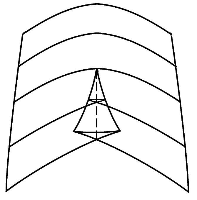 첨점 기하학은 두 번째 매개변수 ''b''를 제어 공간에 추가할 때 접기 분기점에서 어떤 일이 발생하는지 탐구하는 데 매우 일반적이다. 매개변수를 변경하면, 안정성이 손실되는 (''a'',''b'') 공간의 점에 대한 곡선(파란색)이 나타나며, 여기서 안정적인 해는 갑자기 다른 결과로 바뀐다.