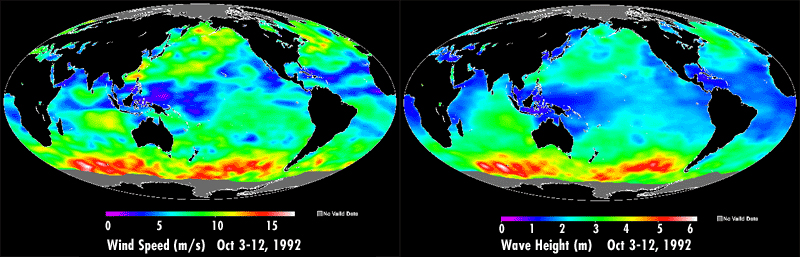 | 한 방향으로의 풍속 | 해역 | 풍속 지속 시간 | 평균 높이 | 평균 파장 | 평균 주기 및 속도 |