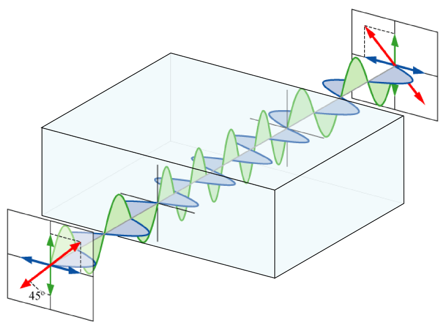 결정의 두께에 따라 양쪽 축을 따라 편광 성분을 가진 빛은 다른 편광 상태로 나타난다. 파장판은 두 성분에 가하는 상대 위상 Γ의 양으로 특징지어지며, 이는 굴절률 차이 Δ''n''과 결정의 두께 ''L''과 다음 공식으로 관련된다.
