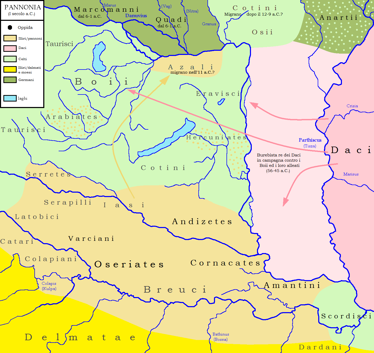 기원전 2세기 말에 일어난 새로운 켈트족 이동의 일환으로, 보이족은 북부 이탈리아를 떠나 다뉴브 강 유역에서 중요한 세력으로 자리 잡았다. 포세이도니우스의 킴브리족 이동 기록(스트라보가 보존)에 따르면, 그들은 처음에는 보이족에게, 그 다음에는 스코르디스키족에게, 그 다음에는 타우리시족에게 쫓겨 헬베티족으로 향했다. 이것은 그 지역의 세력 균형을 묘사한다. 기원전 1세기 초에 다키아인이 새로운 지배 세력으로 등장했다. 다뉴브 강과 티사 강 사이의 지역에 대한 그들의 지배는 느슨했지만, 그 너머의 영토에 상당한 영향력을 행사했다. 기원전 88년, 스키피오 아시아티쿠스 (기원전 83년 집정관)는 스코르디스키족을 너무 심하게 격파하여 그들이 시르미아 동부로 물러났다. 이러한 상황을 이용하여 다키아 왕 부레비스타는 기원전 65년에서 50년 사이에 그들을 정복했고, 그 후 보이족과 타우리시족도 정복했다. 이러한 세력의 쇠퇴 덕분에, 여러 지역 부족들이 독립과 영향력을 되찾았다. 미트리다테스 6세 에우파토르가 북쪽에서 이탈리아를 침략하려던 미완의 계획(기원전 64년)의 맥락에서, 그가 건너려던 영토는 판노니아에 속한 것으로 기록되어 있다. 부레비스타의 죽음 직후 (기원전 44년경), 다키아의 왕국도 붕괴되었고, 로마가 용인할 만한 세력은 이 지역에 남지 않았다.