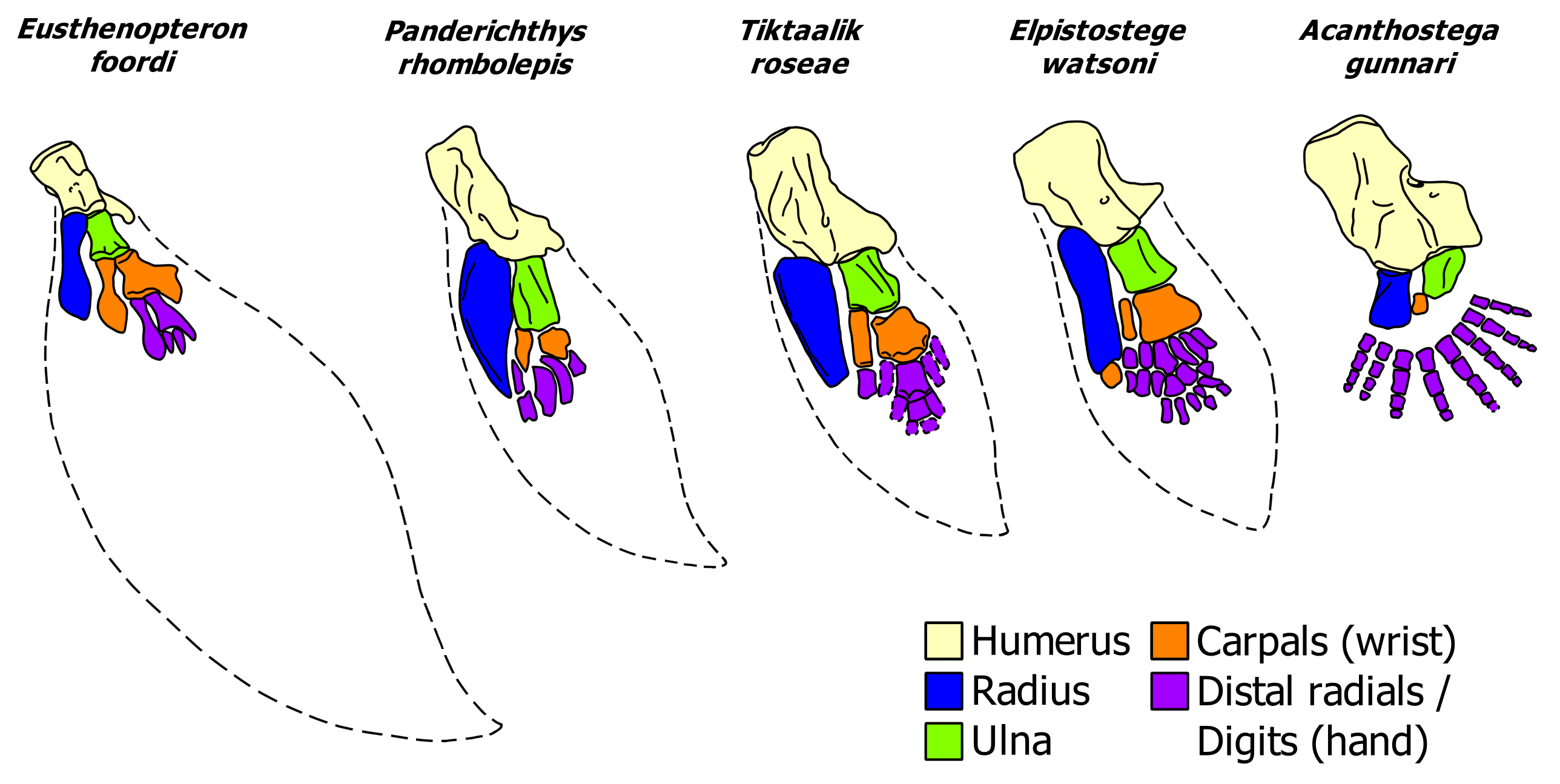 판데리크티스 화석은 지느러미에서 다리로의 변화가 먼저 가슴지느러미에서 시작되었고, 이후 배지느러미(골반 지느러미)가 뒤따랐음을 시사한다.[16] 이는 육상 생활에 적응하면서 몸을 움직이는 역할이 점차 뒤쪽 부속지(가슴지느러미에서 배지느러미로, 나아가 앞다리에서 뒷다리로)로 옮겨갔음을 나타낸다.[17]