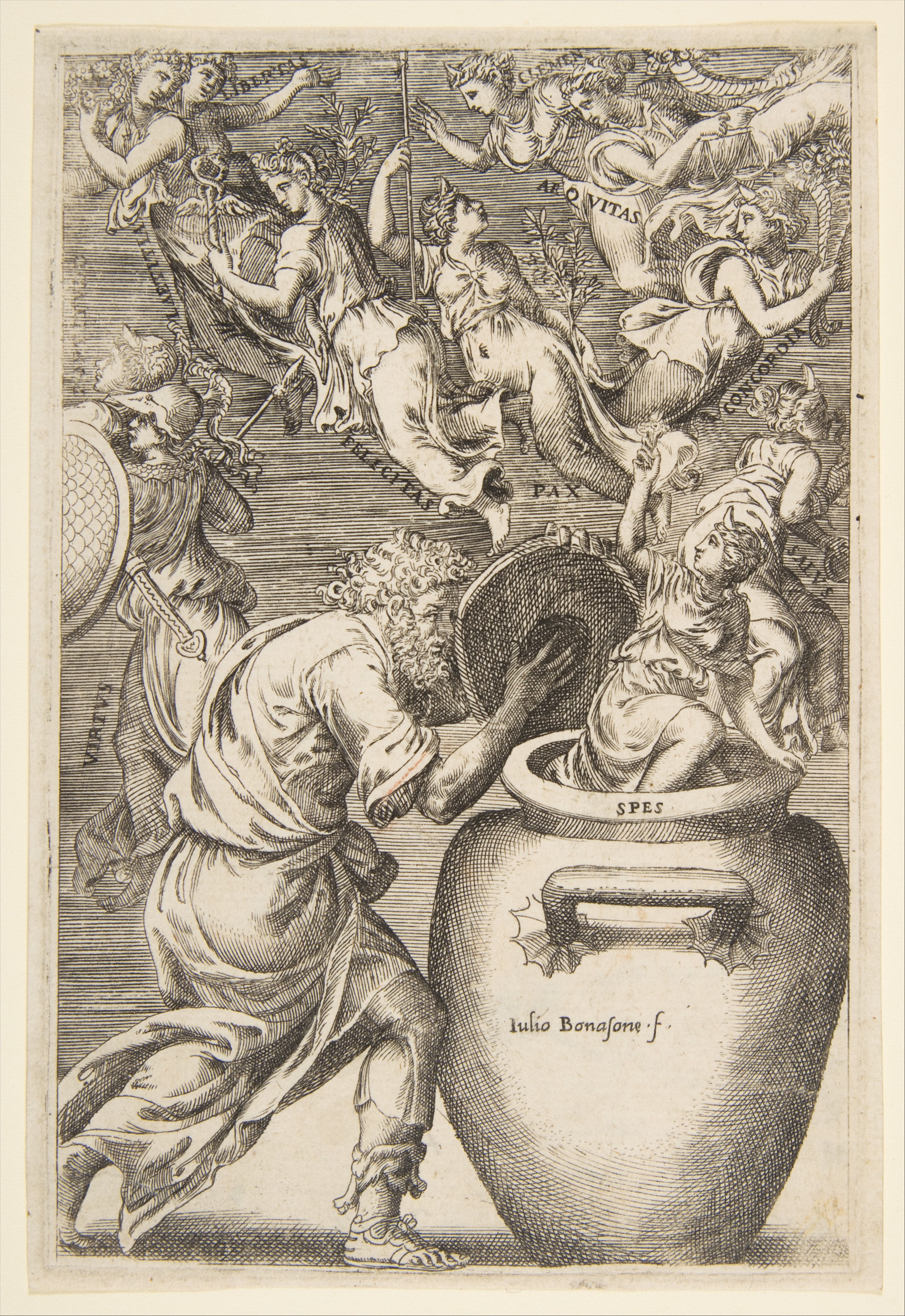 사라진 축복의 본질에 대한 아이디어는 르네상스 시대 판화가 율리오 보나소네에 의해 주어지는데, 여기서 범인은 판도라의 남편인 에피메테우스이다. 그는 로마의 미덕을 나타내는 여성들이 공중으로 날아오르는 큰 저장 항아리의 뚜껑을 들고 있는 모습으로 묘사되어 있다. 그들은 라틴어로 된 이름으로 식별된다: 안전(살루스/salusla), 조화(콘코르디아/Concordiala), 공정(아이퀴타스/aequitasla), 자비(클레멘티아/clementiala), 자유(리베르타스/libertasla), 행복(펠리키타스/felicitasla), 평화(팍스/Paxla), 가치(비르투스/Virtusla) 그리고 기쁨(라이티티아/Laetitiala). 희망(스페스/spesla)은 입술에 머물러 있고 그녀의 속성인 꽃을 높이 들고 있다.[20]