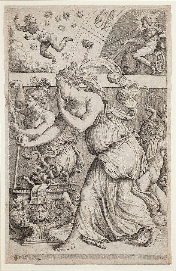 마르코 안젤로 델 모로의 베네치아 판화는 고풍스러운 옷을 입은 여자가 상자를 여는 장면을 묘사하는데, 판도라 옆에는 불타는 횃불을 든 여자가 있고, 반대 방향으로 뿔 달린 인물이 도망친다. 판도라가 얼굴 앞으로 손을 든 것은 무지를 나타내거나,[36] 눈부심을 가리는 행동으로 해석될 수 있으며, 상자에서 나오는 뱀은 고대 지혜의 상징이다.[37] 아폴로는 물병자리를 가리키며, 반대편에서 떨어지는 인물은 루시퍼로 해석될 수 있다. 열린 상자가 축복인지, 지식의 모호한 본질이 도움이 될지 해가 될지는 의문으로 남는다.