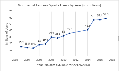 판타지 스포츠 & 게이밍 협회(Fantasy Sports & Gaming Association)에 따르면 미국과 캐나다의 판타지 스포츠 이용자 수는 1988년 50만 명에서 2003년 1,520만 명으로 증가했으며, 그 후 몇 년 동안 약간 감소했다가 2008년 2,990만 명, 2022년 6,250만 명으로 증가했다.[37] 2015년, ''포브스(Forbes)''는 연간 도박이 아닌 판타지 스포츠 사용자 수가 2011년 이후 25% 증가했다고 추정했다.[59] 이러한 성장은 FanDuel 및 DraftKings와 같은 새로운 일일 판타지 스포츠 리그에 수억 달러의 투자를 장려했다.[59]북미 이외 지역에서도 판타지 스포츠 산업은 최근 성장세를 보였다. 일일 판타지 스포츠의 개발은 유럽 시장의 성장을 장려했다.[60][61] ESPN 슈퍼 셀렉터(ESPN Super Selector)는 판타지 크리켓을 위해 2001년에 출시되었으며, 2003년 크리켓 월드컵 기간 동안 50만 명의 사용자를 보유했다.[62] 2017년까지 인도에는 4천만 명의 판타지 스포츠 이용자가 있었다.[63] 2019년에는 그 수가 9천만 명으로 증가했으며,[64] 2020년에는 약 1억 명의 인도인이 판타지 스포츠에 참여했다.[65] 인도 판타지 스포츠 시장의 선두 주자인 Dream11은 2019년 인도 프리미어 리그(IPL)와 4년 후원 계약을 체결했다.[66]