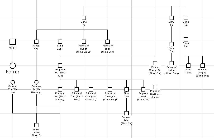 주목할 만한 다른 인물들로는 진 회제, 회제의 첫 섭정 양준(楊駿), 양지(楊芷) 황태후, 가남풍(賈南風) 황후, 그리고 고위 관료 위관(魏管)이 있다.[2]