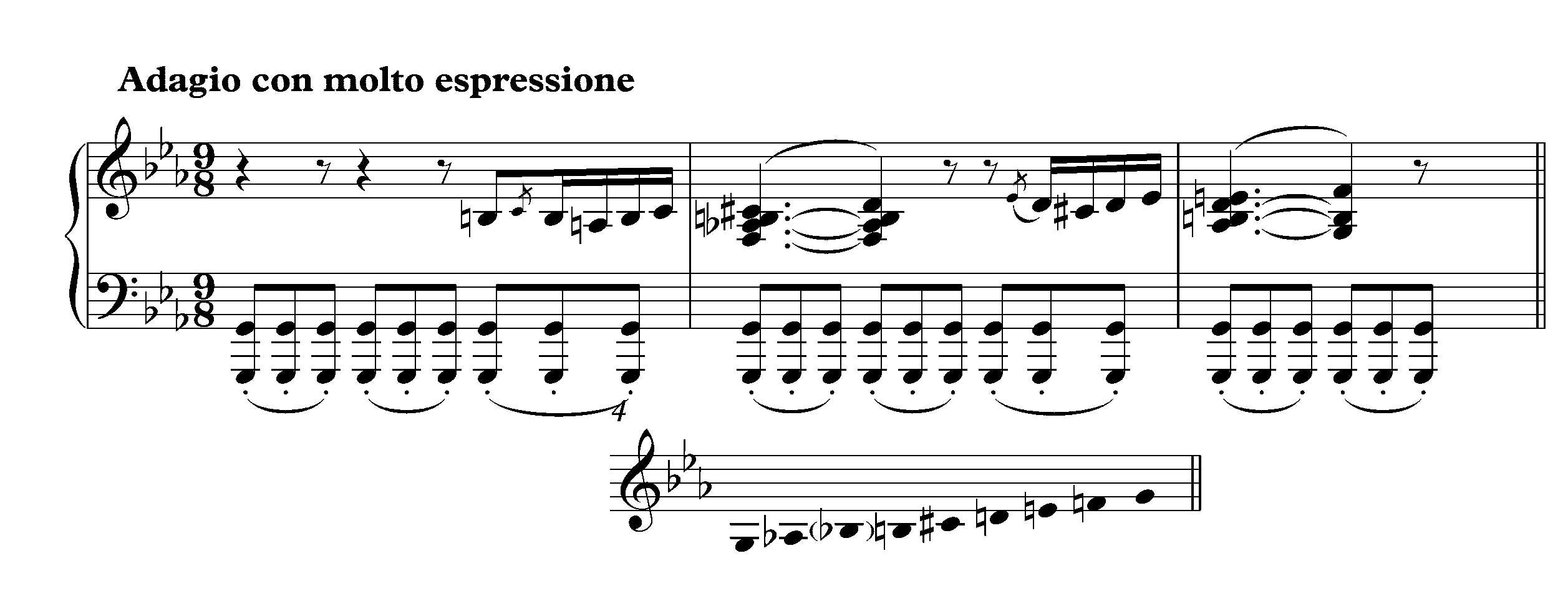 1800년, 루트비히 판 베토벤은 피아노 소나타 11번 B 플랫 장조, 작품 22번을 작곡했다. 이 작품의 느린 악장에는 당시로서는 매우 불협화음적인 화성이 사용된 부분이 있다. 피아니스트 안드라스 쉬프는 2005년 강연에서 이 부분의 화성에 대해 "정말로 특별하다"고 묘사했다. 이 부분의 두 번째와 세 번째 마디의 시작 부분의 화음 진행은 팔음음계이다.[2]