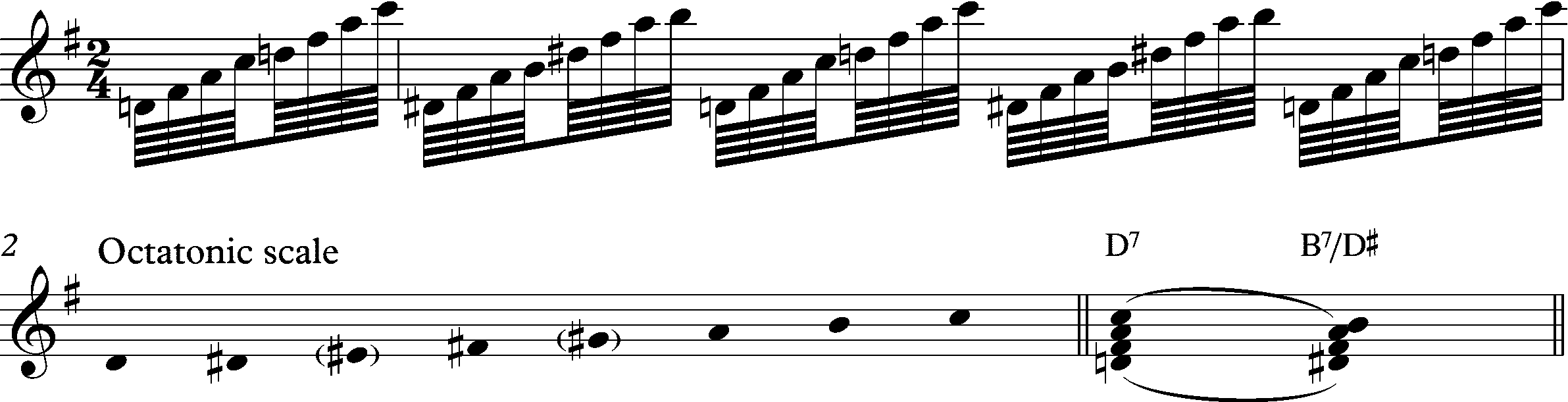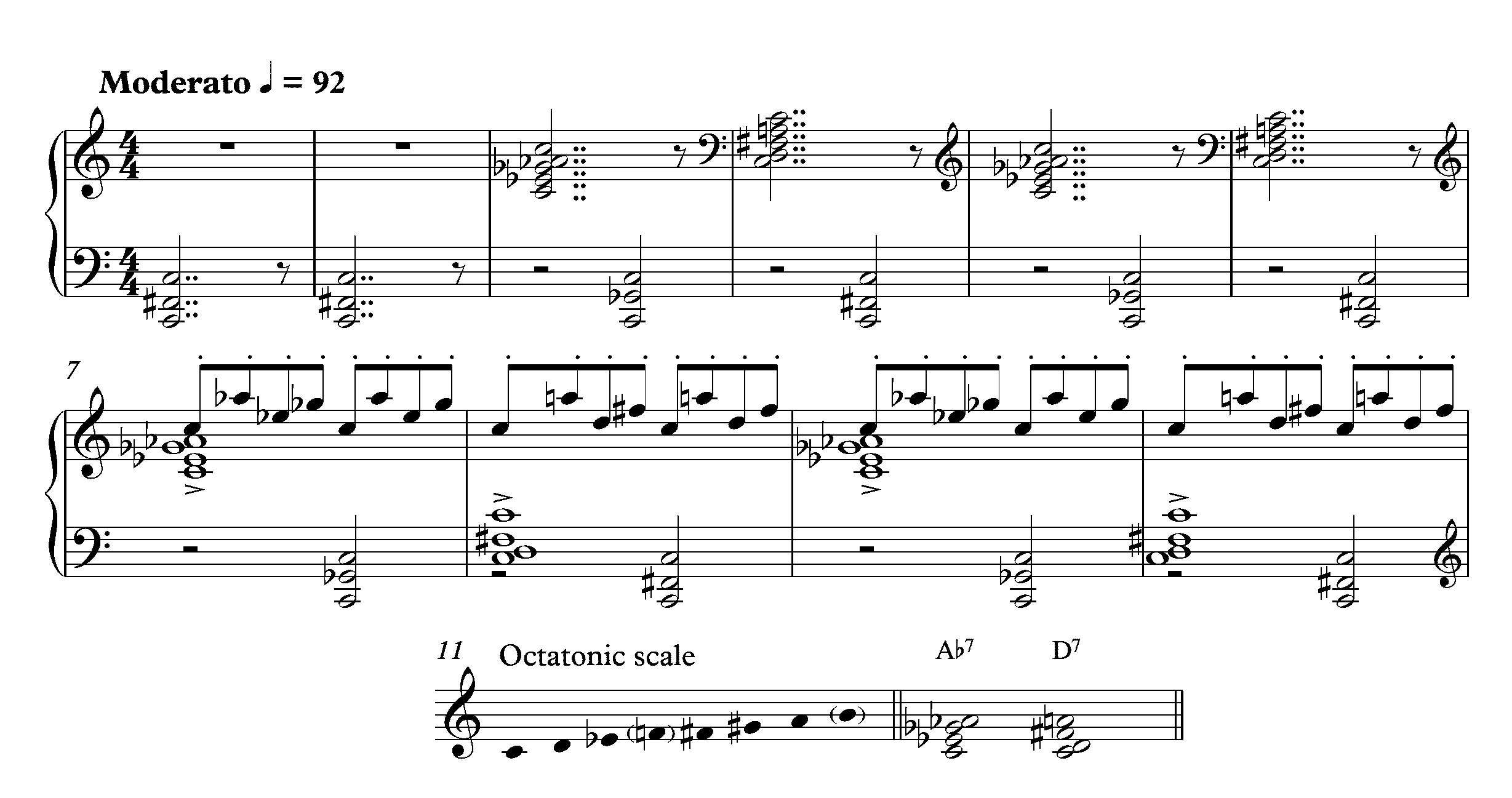 팔음음계는 "3화음과 선법적 테트라코드와 같은 친숙한 화성 및 선형 구성을 이례적이지만 합리적인 틀 안에서 병치"시킬 수 있도록 한다.