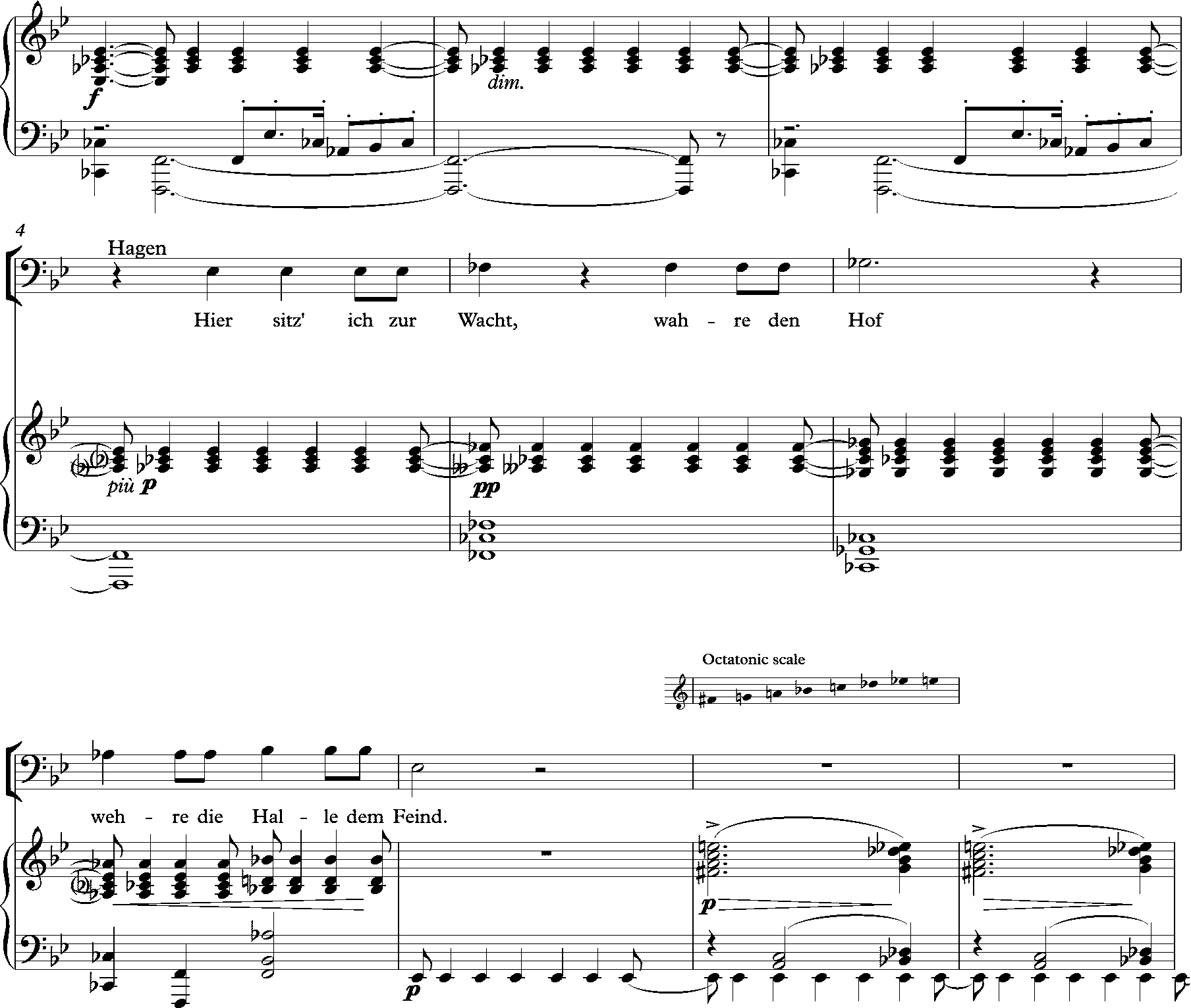 리하르트 바그너의 오페라 ''신들의 황혼''에서 가장 어둡고 불길한 장면 중 하나인 "하겐의 시계"는 12개의 반음 중 11개를 사용하여 반음계적 화성을 특징으로 하며, 그 안에서 팔음음계의 8개 음을 아래 9–10마디에서 찾을 수 있다.[2]