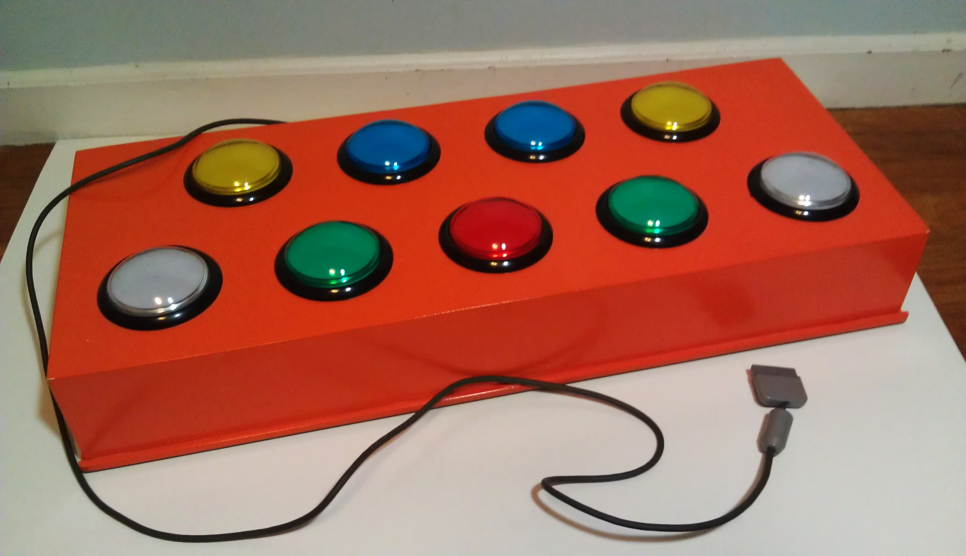《팝픈 뮤직》의 컨트롤러는 타 비마니의 리듬 게임 시리즈들과는 달리 실존하는 악기를 본뜬 것이 아니라 아홉 개의 커다랗고 둥그런 버튼으로 구성되어 있다. 아홉 개의 버튼은 위의 네 개, 아래의 다섯 개로 나뉘어 있다.[18]