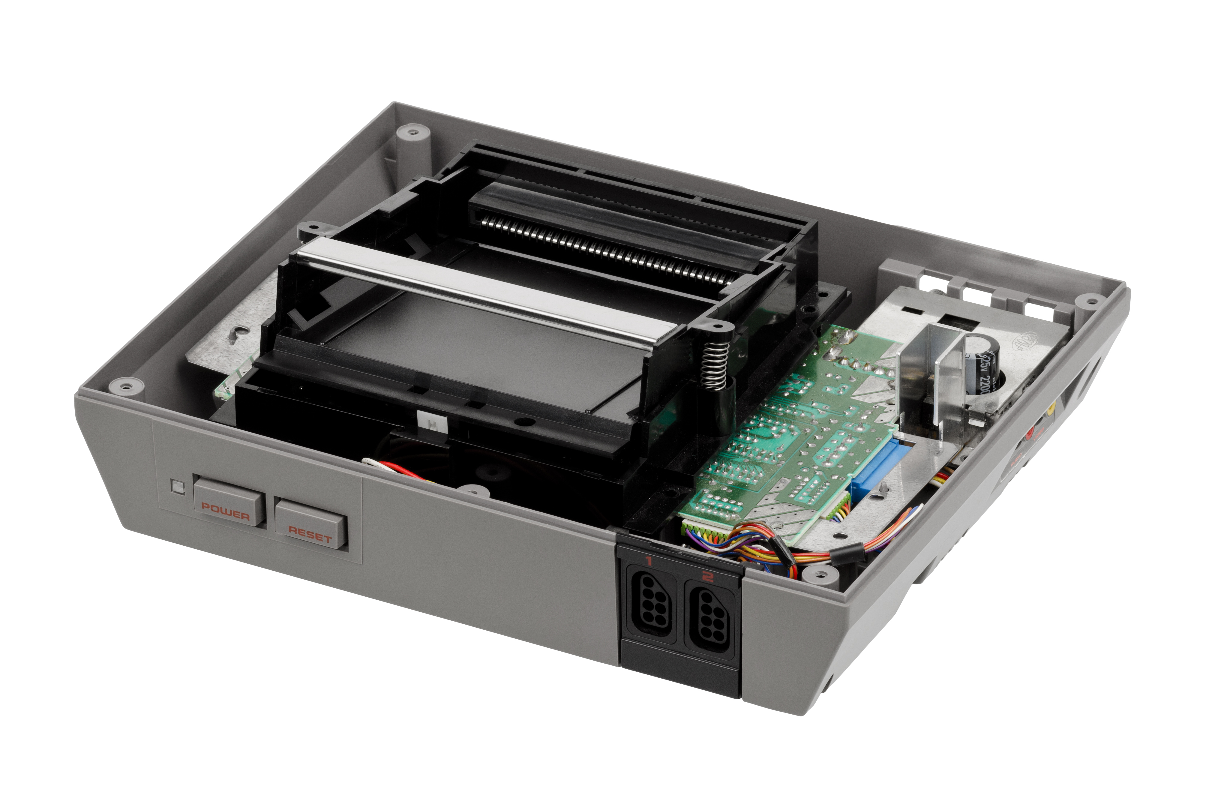 NES는 패밀리컴퓨터의 상단 로딩 카트리지 슬롯 대신 비디오 카세트 레코더를 연상시키는 전면 로딩 챔버로 교체되었다.[33] 또한, 패밀리컴퓨터의 하드 와이어드 컨트롤러와 AVS의 무선 컨트롤러는 분리 가능한 유선 컨트롤러를 위한 두 개의 맞춤형 7핀 소켓으로 교체되었다.