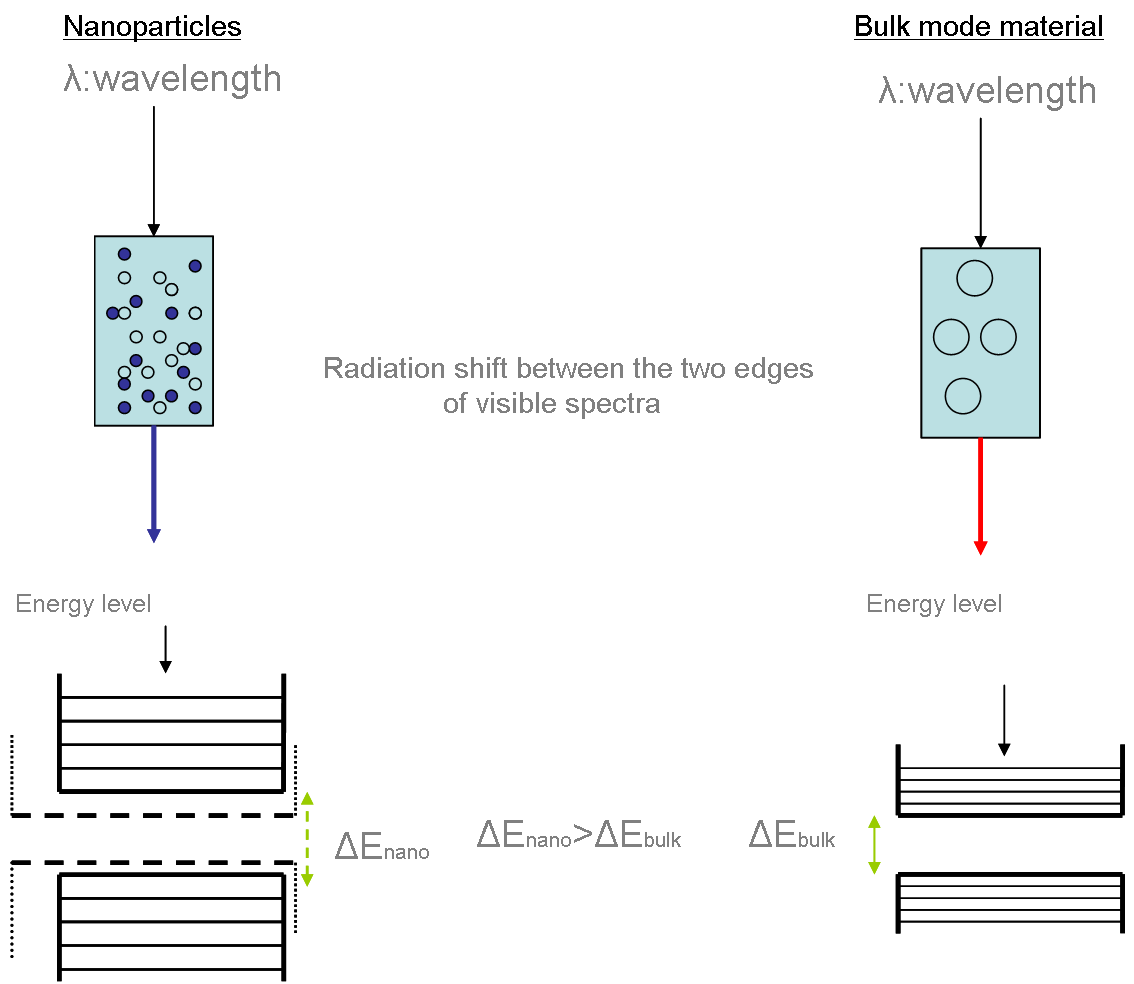 가둠 차원이 입자의 파장에 비해 클 때 입자는 자유롭게 움직이는 것처럼 행동한다. 이 상태에서는 연속적인 에너지 상태로 인해 띠 간격이 원래 에너지에 유지된다. 그러나 가둠 차원이 감소하여 특정 한계, 일반적으로 나노 크기에 도달하면 에너지 스펙트럼이 이산적이 된다. 결과적으로 띠 간격은 크기에 따라 달라진다. 입자의 크기가 작아짐에 따라 전자와 전자 정공이 가까워지고, 활성화하는 데 필요한 에너지가 증가하여 궁극적으로 발광 스펙트럼의 청색 편이를 유발한다.