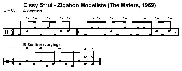 짐 페인은 펑크 드럼 연주가 오스티나토를 중심으로 즉흥 연주에 대한 "폭넓은" 접근 방식을 사용하며, 이는 "약간의 변형만" 반복되며 펑크의 "매혹적인" 본질을 야기한다고 말한다.[39]