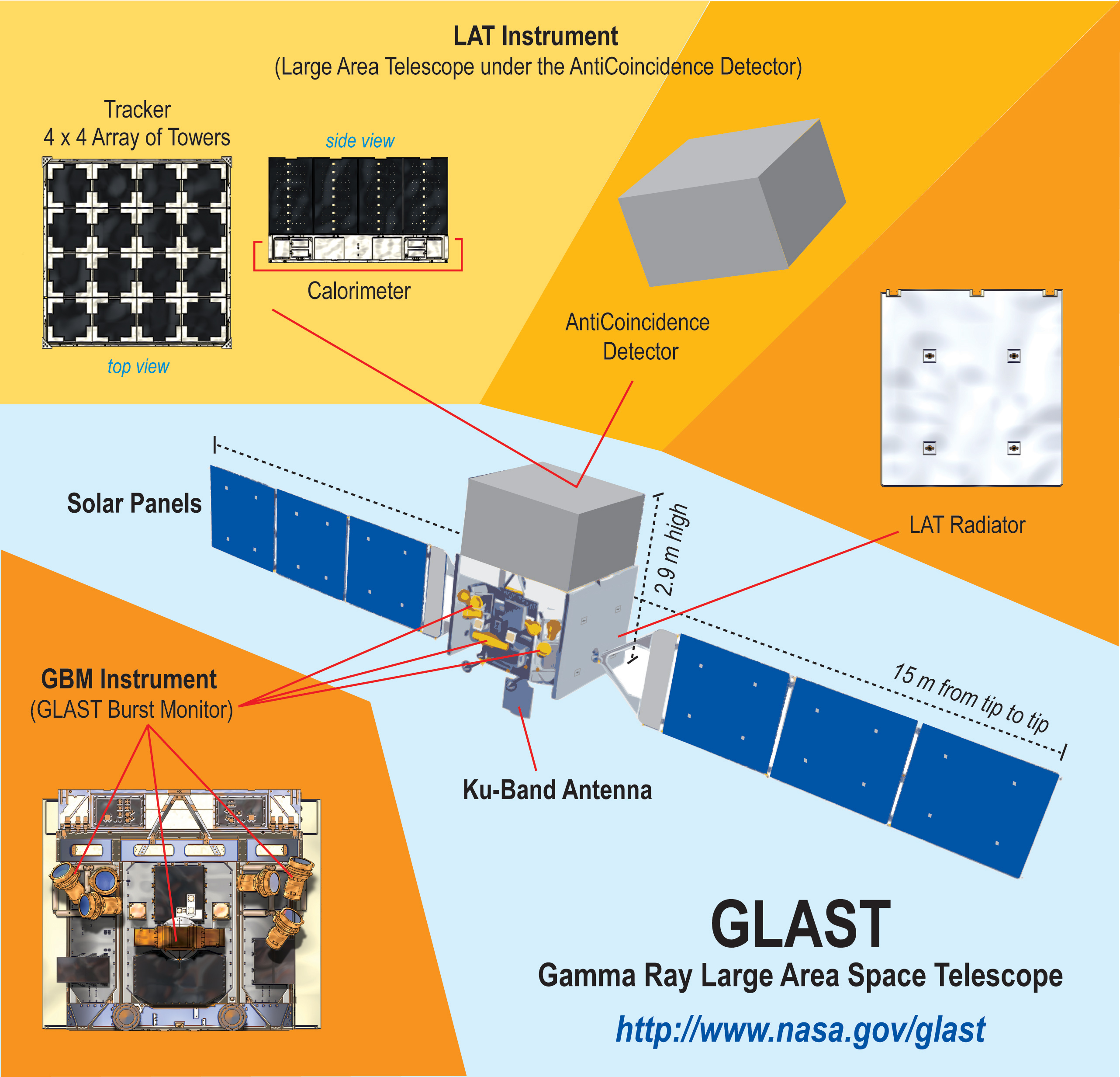 페르미 감마선 우주망원경에는 두 개의 주요 과학 장비가 탑재되어 있다. 바로 대형 면적 망원경(LAT)과 감마선 폭발 감시기(GBM)이다.