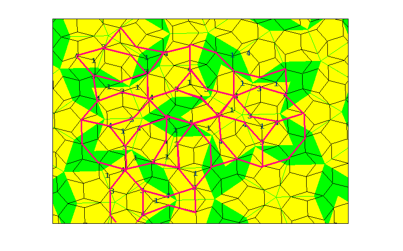 - 비주기적으로 평면을 채우기 위해 '연결 규칙'이 필요하다. 이 규칙은 꼭짓점이나 모서리에 라벨을 붙이거나, 타일 면에 패턴을 그리거나, 모서리 모양을 변형하는 방식으로 적용된다.[139][156][7][25]