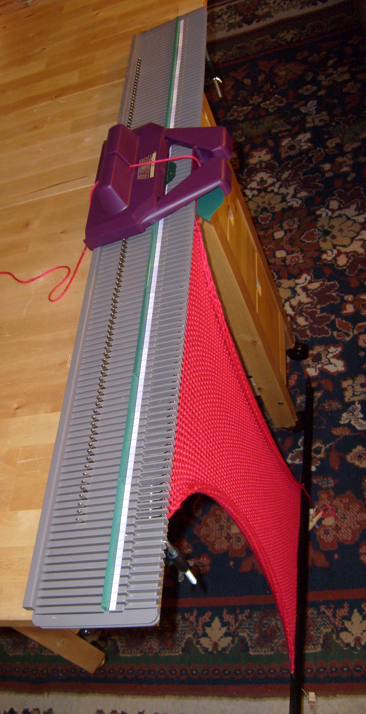 가정용 편물기는 손 뜨개질과 유사한 직물을 생산하는 ''위사'' 편물 방법을 사용한다. 손으로 뜨개질하는 것보다 더 빠르게 진행되며, 손으로 (일반적으로 두 개의) 곧은 뜨개질 바늘을 잡고 각 스티치를 줄 전체에서 개별적으로 조작하는 대신, 편물기는 한 번의 움직임으로 전체 줄의 루프를 작업한다.