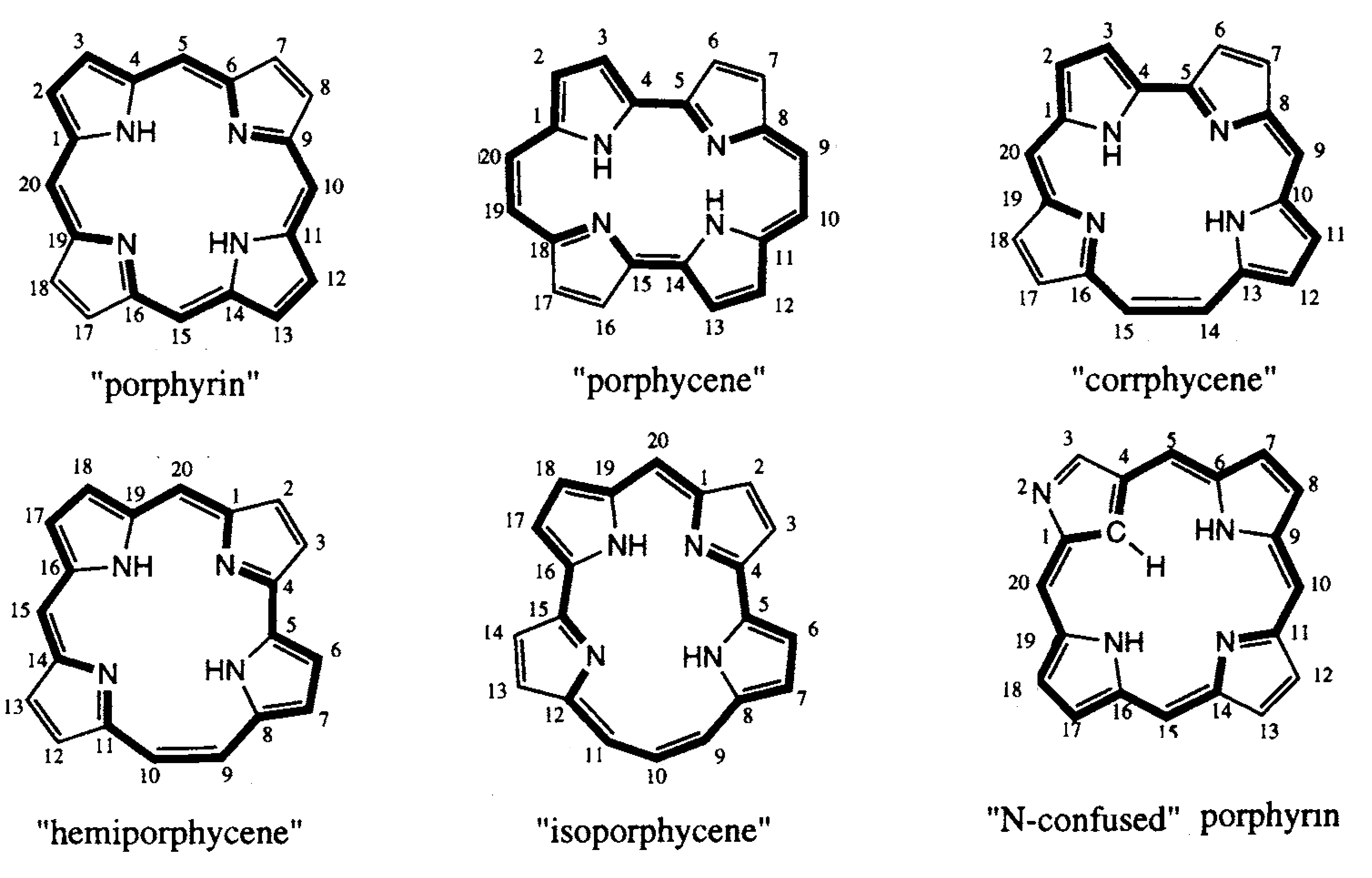 포르피린 복합체는 사각형 평면 MN4 코어로 구성된다. 포르피린 주변부는 sp2 혼성화 탄소로 구성되어 있으며, 일반적으로 평면에서 약간 벗어난 형태를 보인다. "주름진" 또는 안장 모양의 포르피린은 시스템과 환경 간의 상호 작용에 기인한다.[5] 금속은 종종 N4 평면 중심에 있지 않다.[6] 자유 포르피린의 경우, 두 개의 피롤 양성자는 서로 트랜스이며 N4 평면 밖으로 돌출된다.[7] 이러한 비평면 왜곡은 변경된 화학적 및 물리적 특성과 관련이 있다. 엽록소 고리는 포르피린보다 더 포화되어 있으며, 더욱 뚜렷하게 비평면적이다.[8]2. 5. 자유 포르피린의 특징