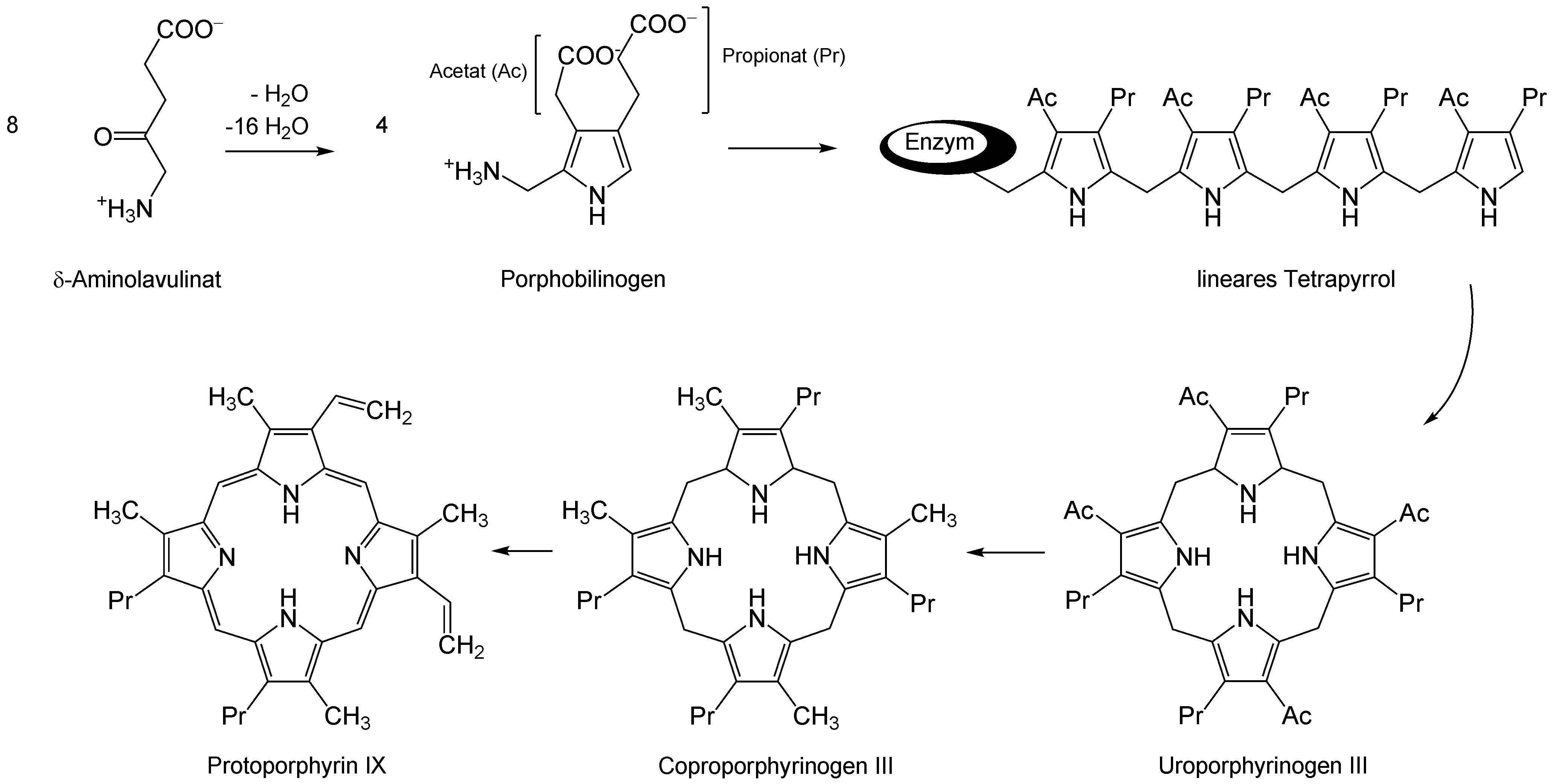 δ-아미노레불린산 2분자는 포르포빌리노겐 생성효소에 의해 포르포빌리노겐으로 전환되고, 4분자의 포르포빌리노겐은 포르포빌리노겐 탈아미노효소에 의해 히드록시메틸 빌레인으로 중합된다. 히드록시메틸 빌레인은 유로포르피리노겐 III 합성효소에 의해 유로포르피리노겐 III으로 고리화된다. 유로포르피리노겐 III는 이후 여러 단계를 거쳐 프로토포르피린 IX로 전환되며, 여기에 페로킬라타제가 철 이온을 결합시켜 헴을 생성한다.
