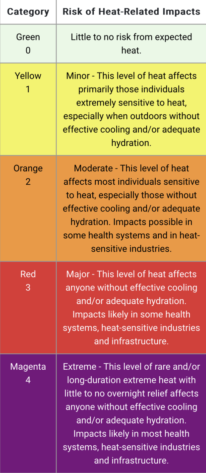 영국에서는 영국 기상청이 열 건강 경계 시스템을 운영하고 있다. 이 시스템은 각 지방 자치 단체 지역을 네 단계로 분류한다. 폭염 조건은 낮 최고 기온과 밤 최저 기온이 특정 지역의 임계값을 초과할 때 발생한다. 임계값을 초과하는 시간의 길이에 따라 단계가 결정된다. 1단계는 일반적인 여름 조건을 나타낸다. 2단계는 기온이 이틀과 그 사이 밤에 임계값을 초과할 위험이 60% 이상일 때 발생한다. 3단계는 전날과 전날 밤에 기온이 임계값을 초과했고, 다음 날에도 임계값을 초과할 가능성이 90% 이상일 때 발생한다. 4단계는 조건이 이전 세 단계보다 더 심각할 경우 발동된다. 처음 세 단계는 사회 및 보건 서비스의 특정 대비 및 대응 상태를 야기한다. 4단계는 더 광범위한 대응을 수반한다.[12] 폭염의 임계값은 전국 대부분 지역에서 25°C 이상의 기온이 3일 이상 지속될 때 발생한다. 대런던은 28°C의 임계값을 갖는다.[13]