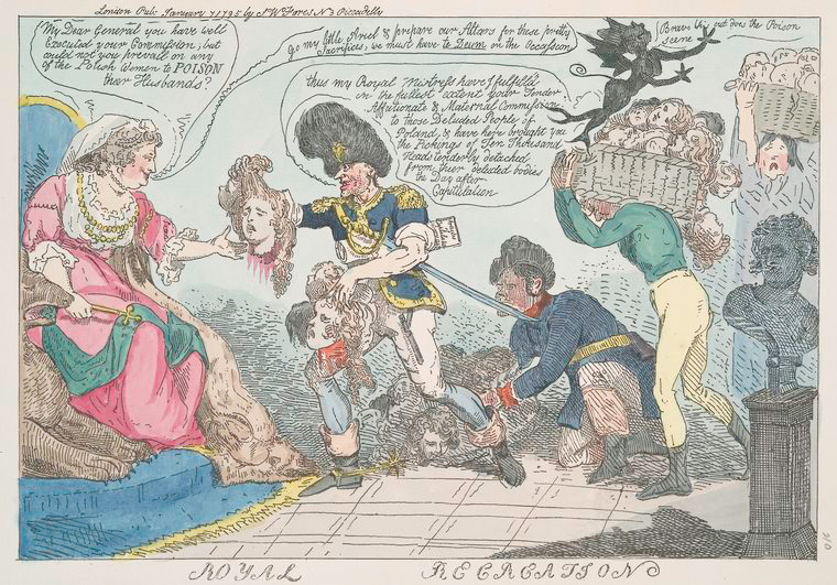 프라가 함락 이후, 바르샤바 방어 사령관과 시민들은 저항 의지를 상실했다. 토마즈 바브르제키는 바르샤바도 프라가와 같은 운명을 맞을 것이라 판단하여 11월 5일 잔여 부대를 이끌고 남쪽으로 퇴각했다.[37] 바르샤바는 별다른 저항 없이 러시아군에 함락되었다. 알렉산드르 수보로프는 예카테리나 2세에게 "만세 - 프라가 - 수보로프"라는 짧은 보고를 올렸고, 예카테리나 2세는 "축하하네, 야전원수, 예카테리나"라고 답신했다.[37] 수보로프는 이 승리로 야전원수로 진급했으나,[33] 프라가에서의 학살은 그의 명성은 물론 러시아군의 명성까지 실추시켰다.[38]5. 2. 수보로프의 승진과 국제적 비난
