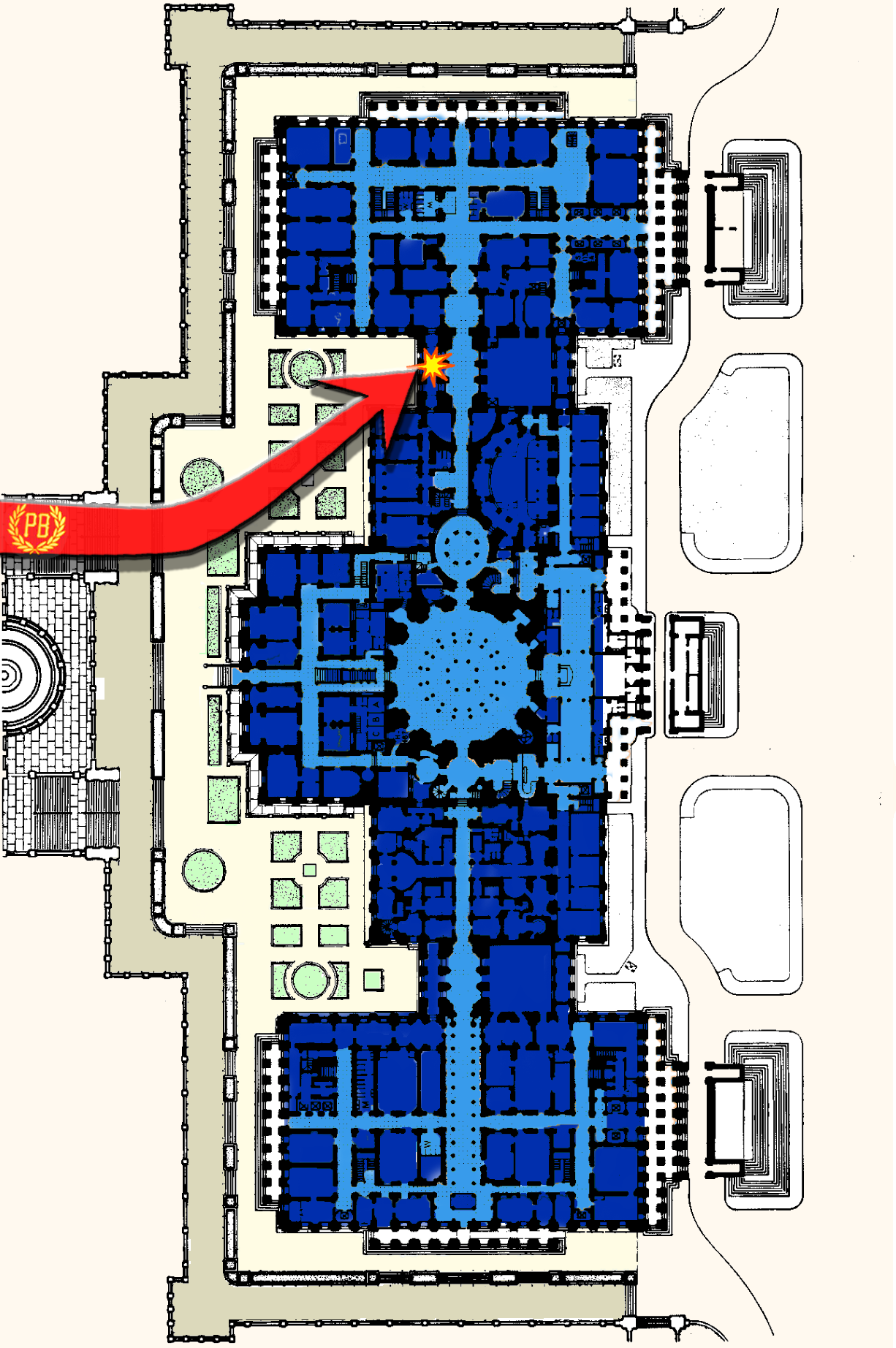 나중에 공격이 진행됨에 따라 프라우드 보이스는 서쪽에서 국회 경찰에 의해 저지당했다. NYT 조사 영상은 프라우드 보이스 지도자들이 후퇴하여 약 15분 동안 상황을 평가한 다음 공격 대상을 취약한 지점으로 바꾼 방법을 보여준다.[208] 프라우드 보이스가 이끄는 동쪽의 시위대는 광장에서 경찰을 쉽게 제압했다. 서쪽에서는 약 20분간 비계 계단에서 싸운 후 프라우드 보이스가 저항을 돌파하고 국회의사당 계단으로 돌진했다. 국회의사당이 처음으로 돌파된 것은 프라우드 보이스 도미닉 페졸라가 훔친 경찰 방패를 사용하여 창문을 부수면서였다.[209]
