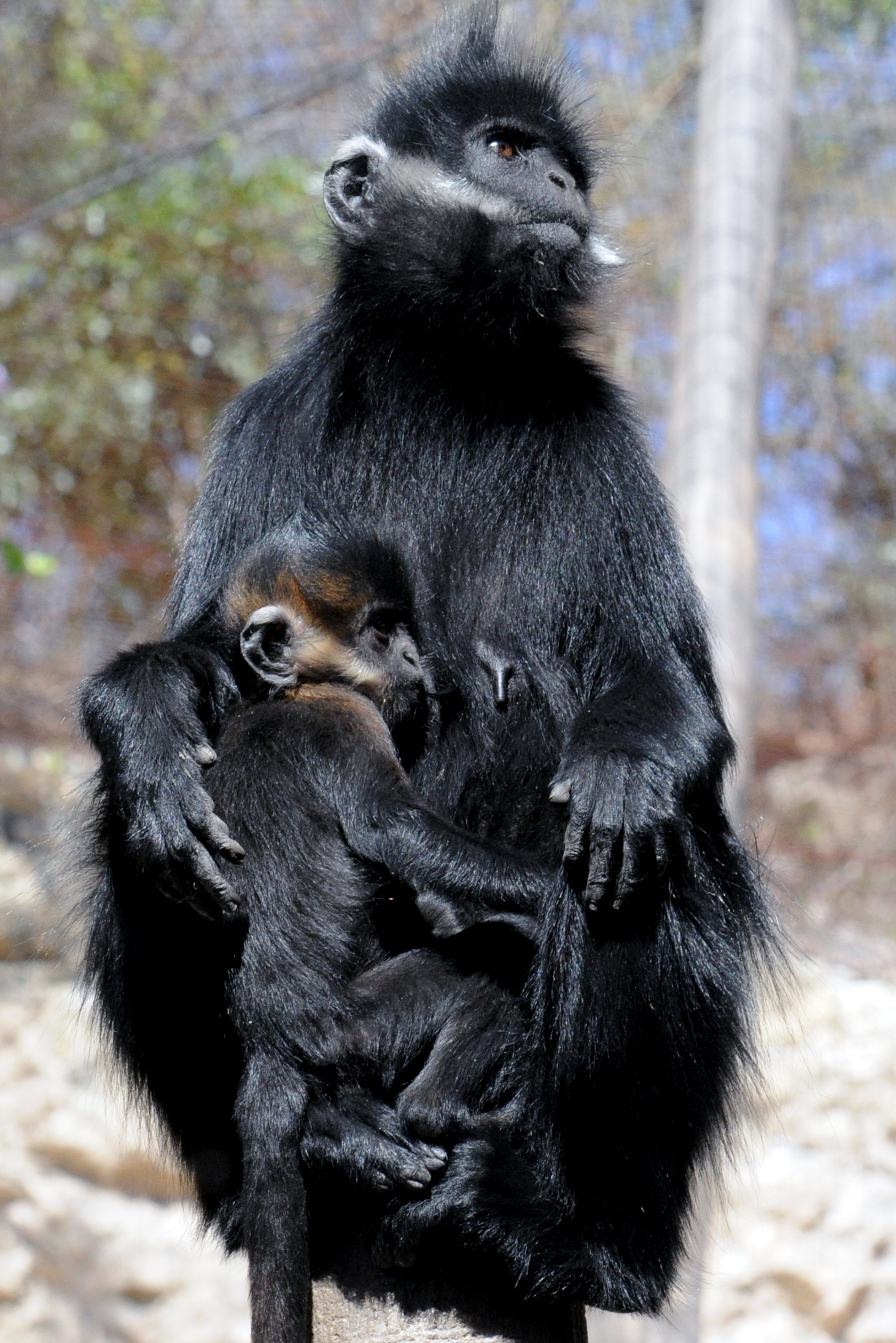 황금랑구르는 인도 아삼 주와 부탄에 분포하며 크림색에서 황금색 털을 가진 멸종위기종 영장류로, 서식지 파괴로 개체수가 감소하여 보호받고 있다. - 루뚱원숭이속 - 검은잎원숭이