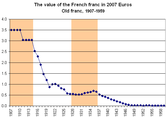 1795년, 국민공회는 프랑을 십진법에 따른 법정통화로 공식 제정했다. 1803년에는 제르미날 프랑이 도입되어 금은 복본위제가 확립되었고, 1865년에는 라틴 통화 동맹이 결성되어 프랑스 프랑을 중심으로 유럽 내 통화 통합을 시도했다. 그러나 제1차 세계 대전 발발로 프랑스는 금본위제를 포기했고, 전후 인플레이션으로 프랑의 가치는 크게 하락했다.