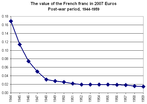 1960년 1월, 프랑스 프랑은 평가절하되어 구 프랑 100개가 신 프랑(nouveau franc) 1개가 되었다.[15] 1958년 디자인의 지폐에는 1963년까지 "NF"라는 약자가 사용되었다. 1프랑과 2프랑짜리 구 화폐는 새로운 상팀(centime)으로 계속 유통되었으며, 1상팀짜리 동전은 널리 유통되지 않았다. 인플레이션은 프랑의 가치를 계속 잠식시켰다. 브레튼우즈 체제가 변동 환율제로 대체되기 전인 1969년 8월 11일에 한 차례 주요 평가절하가 있었다.[16] 1999년 1월 1일 유로가 프랑을 대체했을 때, 프랑의 가치는 1960년 구매력의 8분의 1도 되지 않았다.