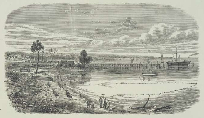 1873년 프랭크스턴 해변, 부두와 마을이 배경으로 보임.