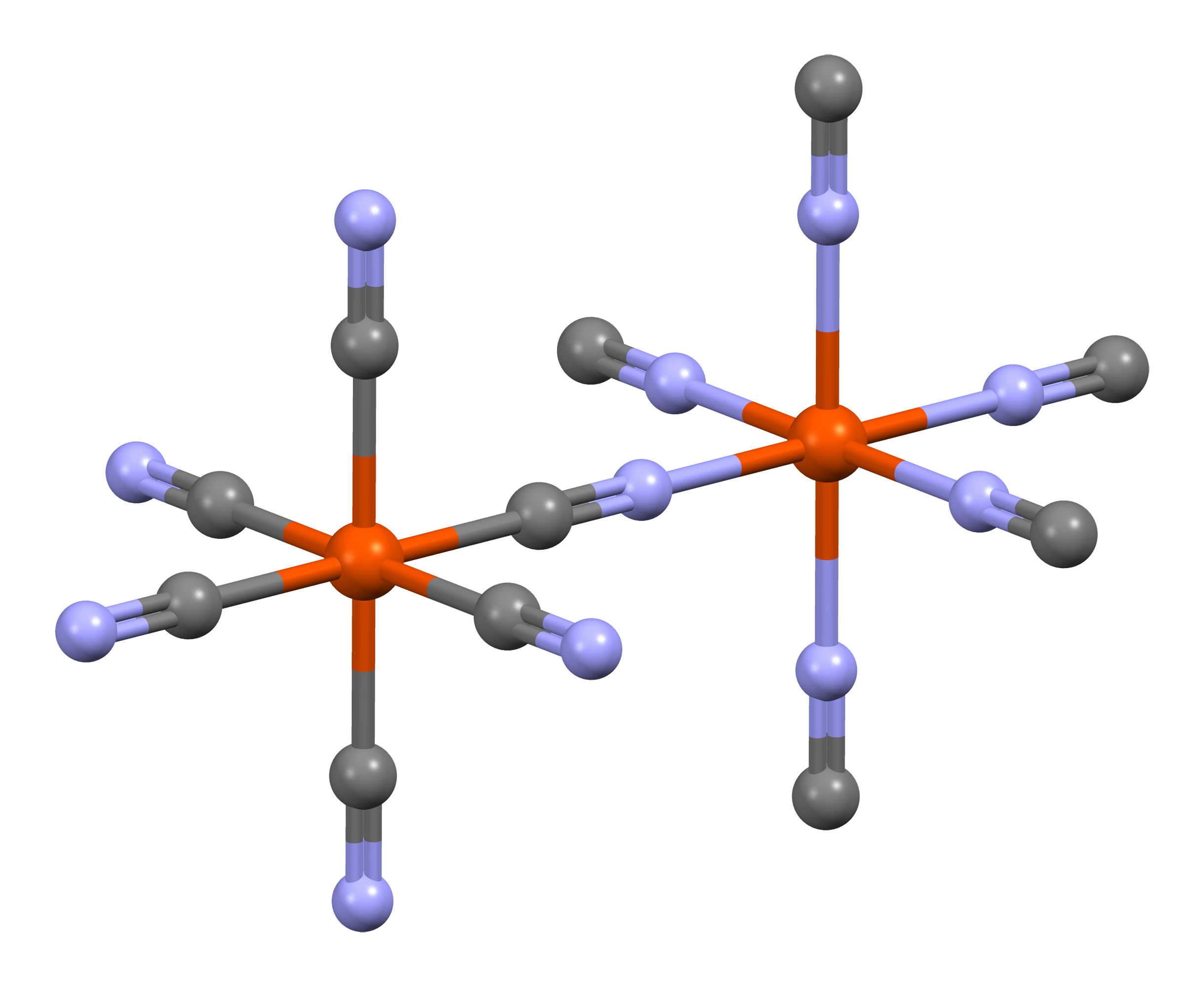 좀 더 구체적으로 살펴보면, 이상적인 불용성 프러시안 블루 결정에서 입방형 구조는 Fe(II)–C–N–Fe(III) 시퀀스로 구성되며, Fe(II)–탄소 거리는 1.92 Å이고 Fe(III)–질소 거리는 2.03 Å이다. 서브유닛의 1/4은 비어 있기도 하다.[42]