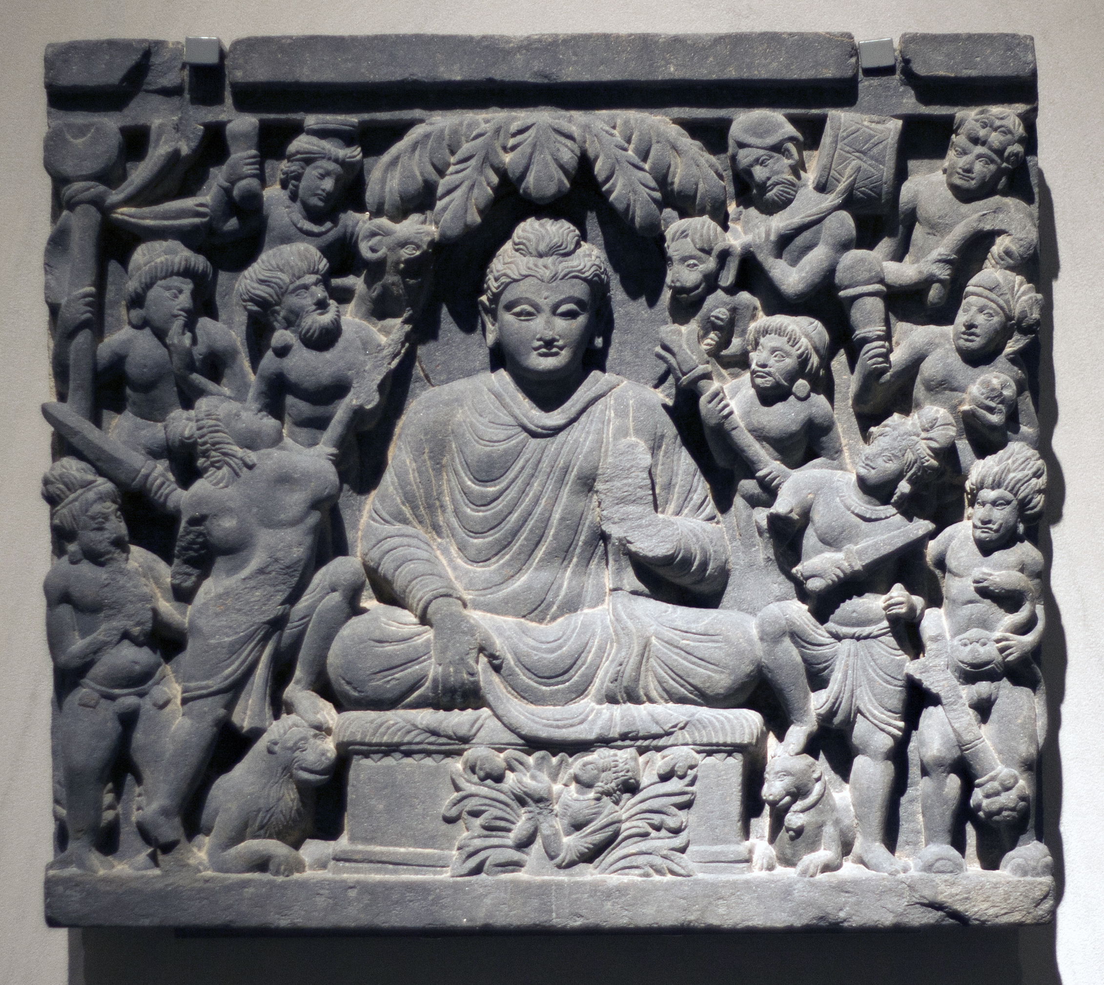 프리티비가 불교 전통에서 가장 두드러진 역할을 한 것은 석가모니 부처의 깨달음의 순간, 즉 ''마라비자야''(마라를 이김) 동안이었다. 보살 싯다르타 고타마가 보리수 아래에서 명상할 때, 악마의 왕 마라는 그의 자격을 의심하고 군대를 보내 그를 방해함으로써 그의 깨달음을 막으려 했다. 마라가 싯다르타에게 그의 과거 선행에 대한 증거를 제시하라고 요구하자, 보살은 오른손으로 땅을 만져, 프리티비를 증인으로 소환하는 "땅을 만지는 제스처"(부미스파르샤 무드라)를 보였다. 프리티비는 땅에서 나타나 마라의 군대를 물리쳤다. 싯다르타는 프리티비를 증인으로 소환함으로써 깨달음이 단순히 영적인 성취일 뿐만 아니라 세상에서의 자신의 행동과 깊이 연관되어 있음을 보여주었다.[2] ''니다나카타''와 같은 이야기의 일부 버전에서는 그녀가 보살의 덕을 말로 증언했다. ''마하바스투''와 같은 다른 설명에서는 그녀가 땅을 흔들게 하여 마라의 군대를 공포에 떨게 하는 등 더 물리적인 반응을 보였다. ''라리타비스타라''에서는 프리티비가 여신들과 함께 땅에서 나타나 육신으로 나타난다. 그녀의 존재와 그에 따른 땅의 흔들림은 마라의 군대를 물리치고 부처가 깨달음을 얻는 데 필요한 평화로운 환경을 조성했다.[2]