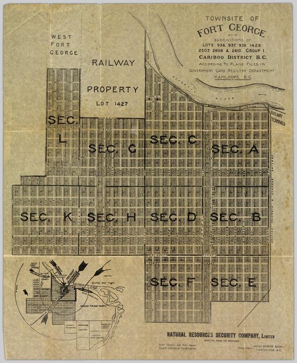 포트 조지 타운 부지는 네차코 강에서 북서쪽으로 약 3.22km 떨어진 곳에 건설되었다. 이 이름은 HBC 무역소의 이름과 유사하다는 우려 때문에 지역 토지 원 소유주들이 등록했다. 내추럴 리소스 시큐리티 컴퍼니의 CEO인 조지 해먼드는 9개의 지역 토지를 매입하고 캐나다와 영국 전역에 과장되고 의심스러운 광고로 포트 조지 지역 사회를 홍보했는데, 포트 조지를 브리티시컬럼비아의 미래 허브, "북쪽의 시카고",[8] 온화한 겨울과 모든 농업 사업에 적합한 곳이라고 묘사했다.[9] 해먼드는 당시 존재하지도 않은 건물과 시설의 존재를 광고에서 주장했다.[10] 1912년에 토지는 400USD에 팔렸고, 1913년까지 500USD~1000USD로 상승했다.[10]