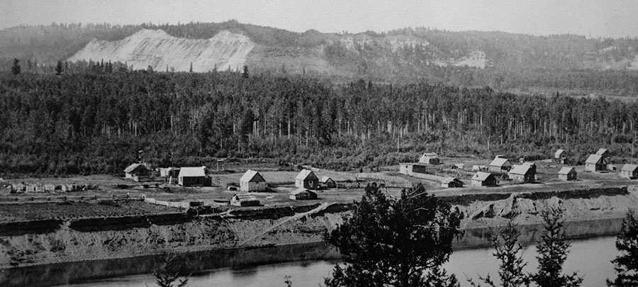1903년, 그랜드 트렁크 퍼시픽 철도(이후 캐나다 국립 철도의 일부)가 모피 무역 기지 근처를 지나갈 것이라는 보고가 나오면서 이 지역의 운명이 바뀌기 시작했다.[9] 1906년에는 HBC 기지 주변에 농업 정착이 시작되었고, 1909년에는 사우스 포트 조지와 포트 조지(때로는 센트럴 포트 조지라고도 함) 두 곳에서 경쟁적인 토지 투기 회사들에 의해 도시 개발이 시작되었다.[9][8] 사우스 포트 조지는 허드슨 베이 회사의 무역 기지에서 가깝고 바로 남쪽에 있는 프레이저 강에 건설되었다.[8] 한편, 그랜드 트렁크 퍼시픽 철도(GTP)는 자체 도시 부지를 확보하려고 노력하면서 프린스 조지가 될 곳의 건설이 여러 해 동안 지연되었다.[9]2. 3. 포트 조지 타운 부지