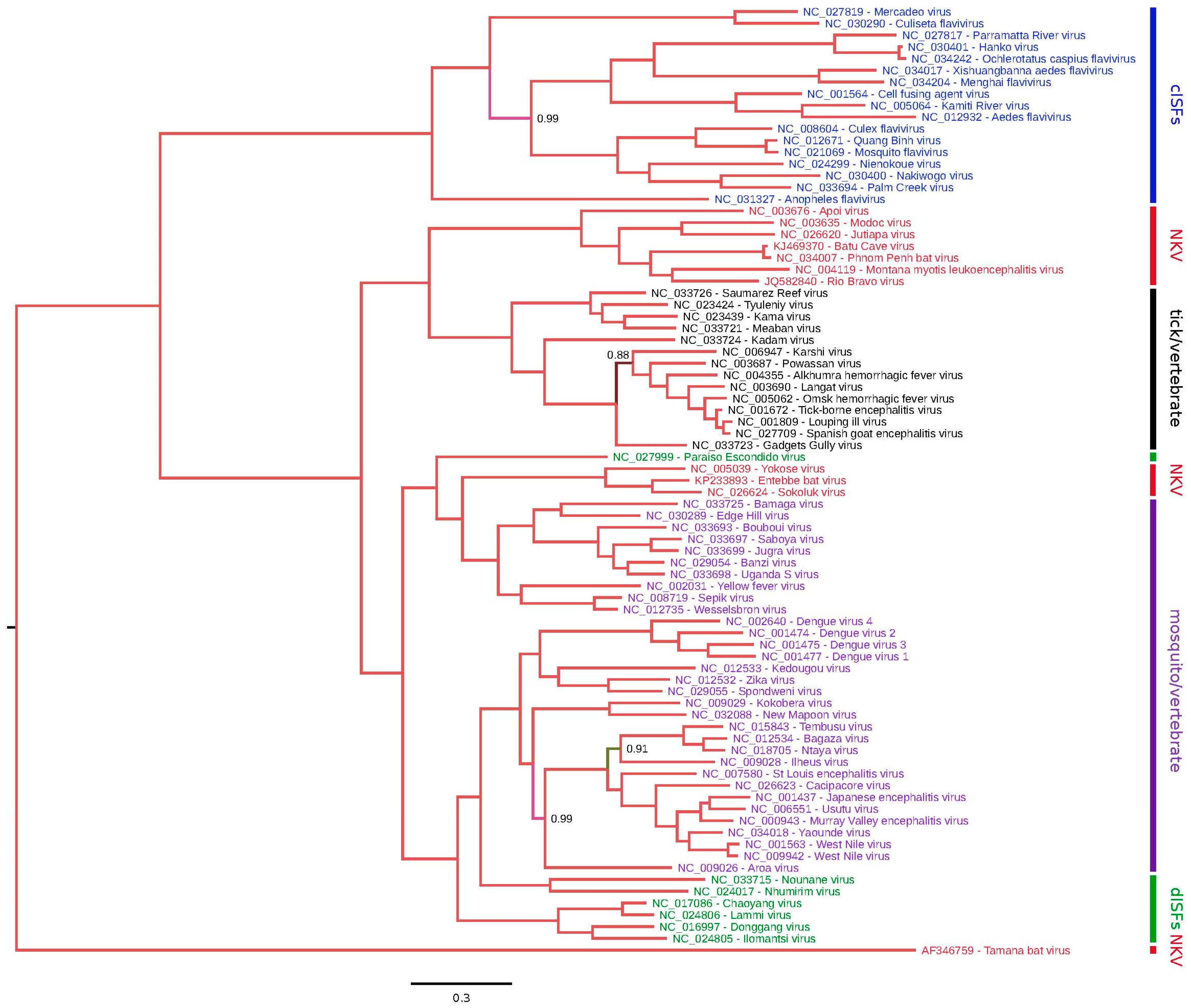 플라비바이러스는 크게 두 개의 분기로 나눌 수 있는데, 하나는 매개체에 의해 전염되는 바이러스이고 다른 하나는 알려진 매개체가 없는 바이러스이다.[32] 매개체 분기는 다시 모기에 의해 전염되는 분기와 진드기에 의해 전염되는 분기로 나눌 수 있다.[33]