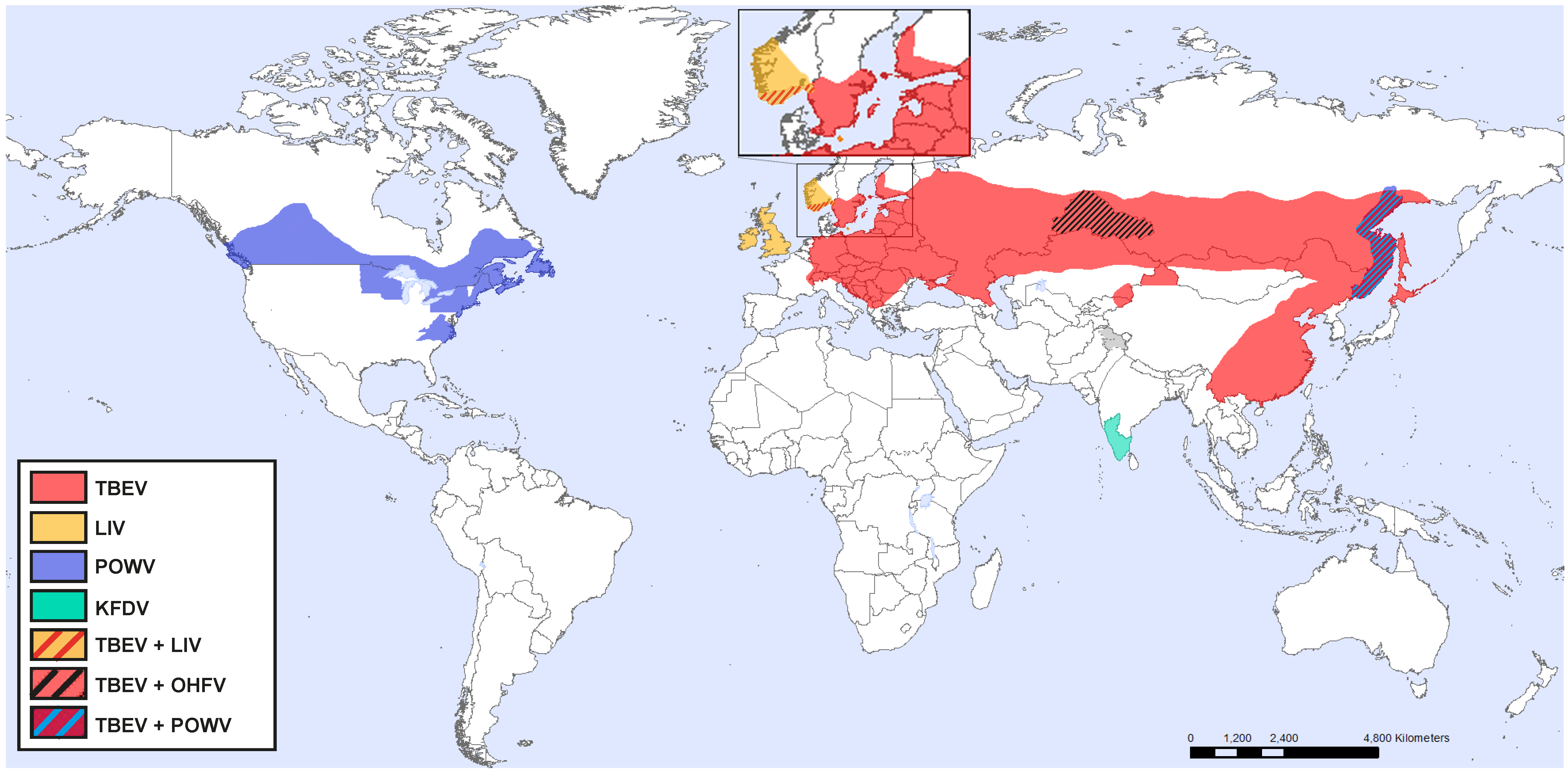 ''웨스트 나일 바이러스''는 약 1000년 전에 별개의 바이러스로 나타났으며,[40] 두 개의 계통(계통 1, 계통 2)으로 발전했다. 계통 1은 전 세계적인 유행의 원인이 되었고, 계통 2는 아프리카 동물원성 질병으로 간주되었으나, 2008년 헝가리에서 처음으로 유럽의 말에서 발견되었다.[41] ''웨스트 나일 바이러스''는 고래류까지 숙주 범위가 확대되었다.[43] ''옴스크 출혈열 바이러스''는 지난 1000년 이내에 진화한 것으로 보이며,[44] 두 개의 분기(A, B)로 나뉜다.
