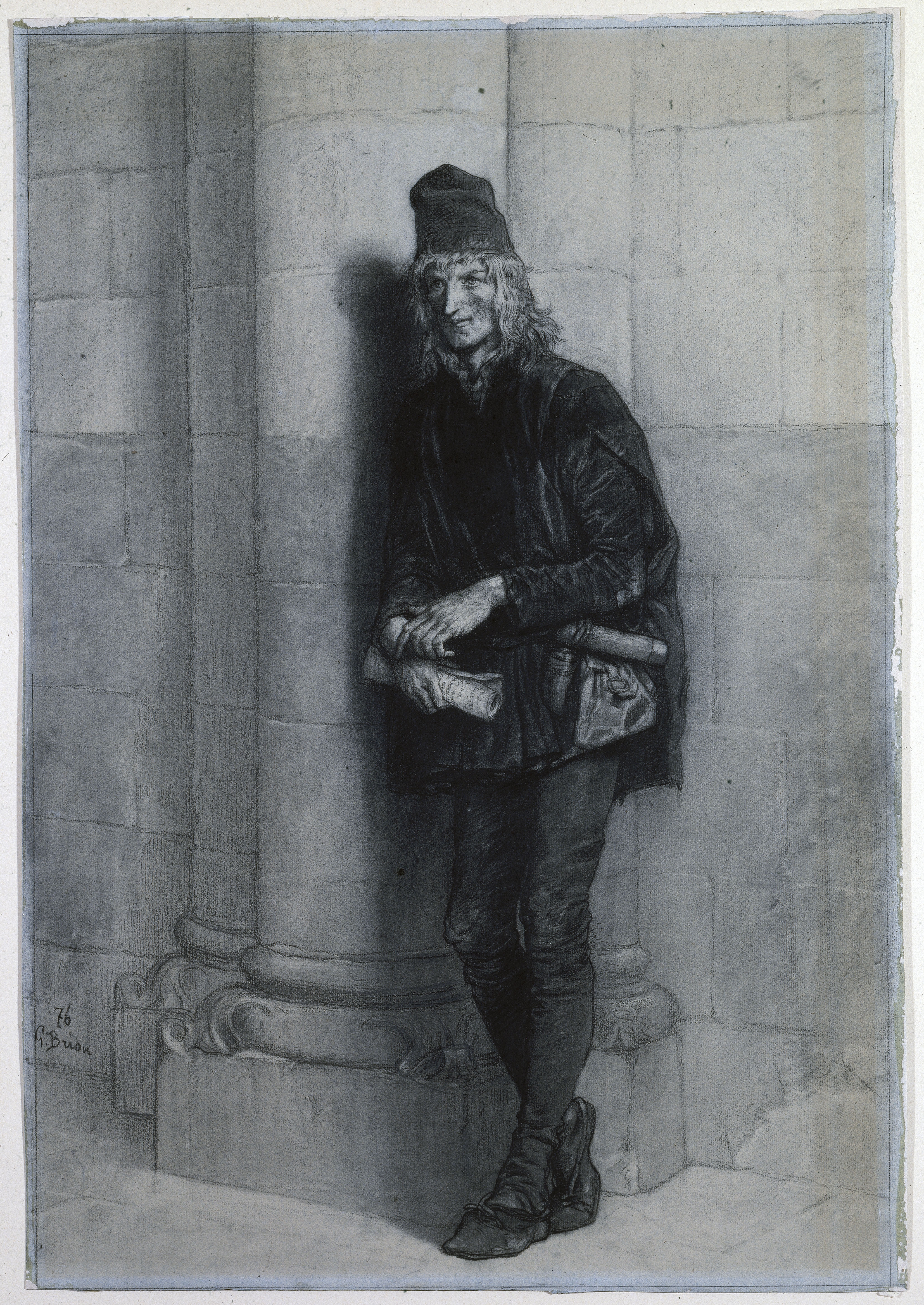 소설의 시작 부분에서, 시민들은 광인절의 주요 행사인 연극을 보기 위해 사법 궁전의 그랜드 홀에 모인다. 그랭구아르가 직접 쓰고 연출한 이 연극은 그의 기대와 달리 거지 행색을 한 '부랑자와 집시 무리의 우두머리' 클로팽에게 방해받는다. 설상가상으로, 군중들이 바보들의 축제의 1일 교황으로 뽑힌 콰지모도를 보러 빠져나가자 그랭구아르는 실망한다. 파리의 밤거리를 헤매던 그는 모닥불 근처에서 춤을 추는 에스메랄다를 보고 그녀에게 반한다.[2]