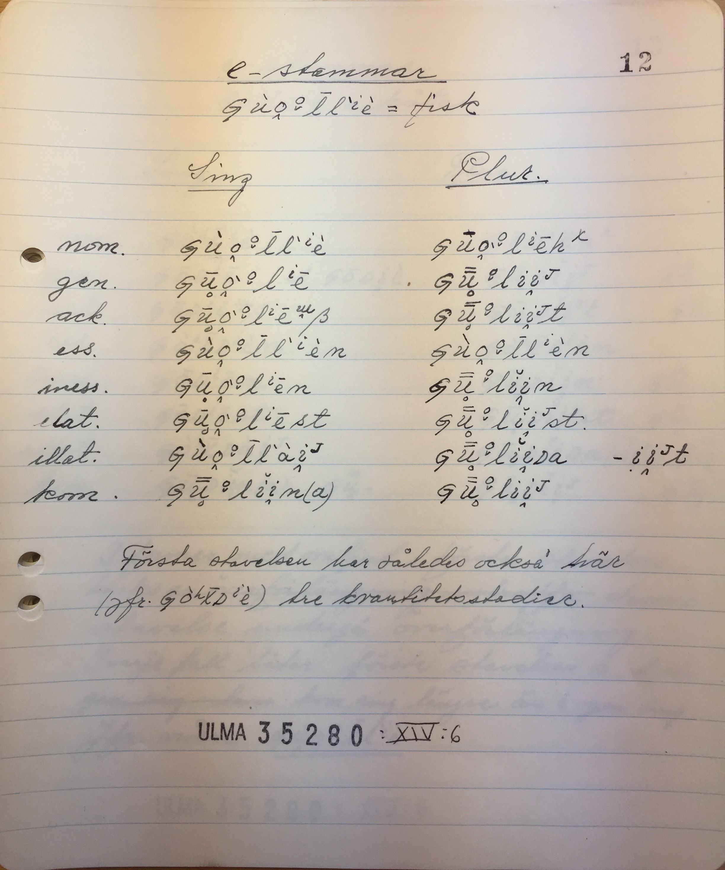- 주된 어휘집으로 의도된 것은 아니지만, 이스라엘 루옹의 1943년 논문 '''Lappische Verbalableitung dargestellt auf Grundlage des Pitelappischen'''[13]은 파생 동사의 풍부한 자료이다. 이들은 다소 단순화된 UPA 유형 전사로 제시되며, 독일어로 설명과 번역이 덧붙여져 있다.