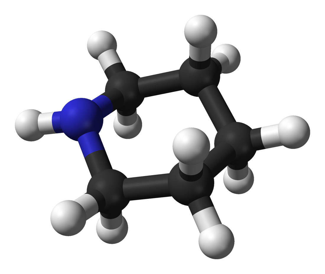 피페리딘과 그 유도체는 제약[26] 및 정밀 화학 물질에서 매우 흔하게 발견되는 구성 요소이다. 피페리딘 구조는 다음과 같은 물질에서 발견된다.