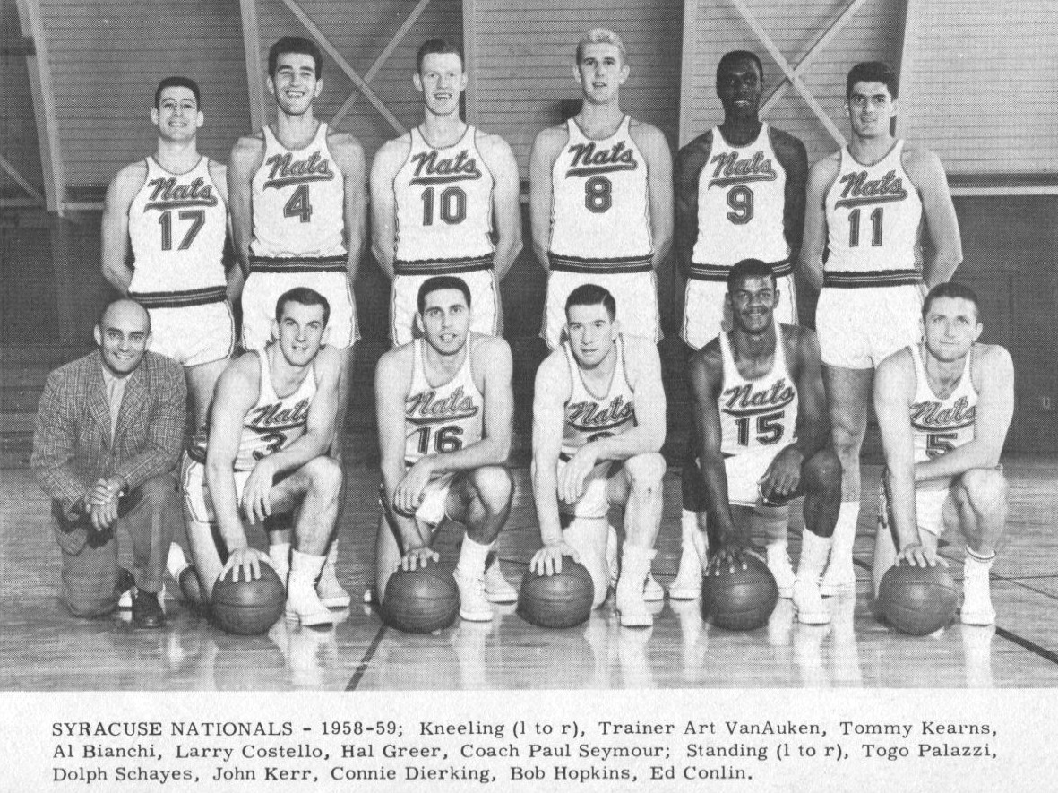 1946년, 이탈리아계 미국인 사업가 대니 바이어소네는 뉴욕주 시러큐스에서 5천달러에 내셔널 농구 리그(NBL)의 '''Syracuse Nationals|시러큐스 내셔널스영어'''를 창단했다.[8] 대부분 중서부 소도시 팀들로 구성된 NBL에서 내셔널스는 첫 시즌인 1946-47 시즌에 21승 23패의 성적을 거두며 4위를 기록했고, 플레이오프에서는 로체스터 로열스에게 패했다. 두 번째 시즌인 1947-48 시즌에는 24승 36패로 5위에 그쳤지만 플레이오프에 진출하여 앤더슨 더피 패커스에게 3연패로 탈락했다.