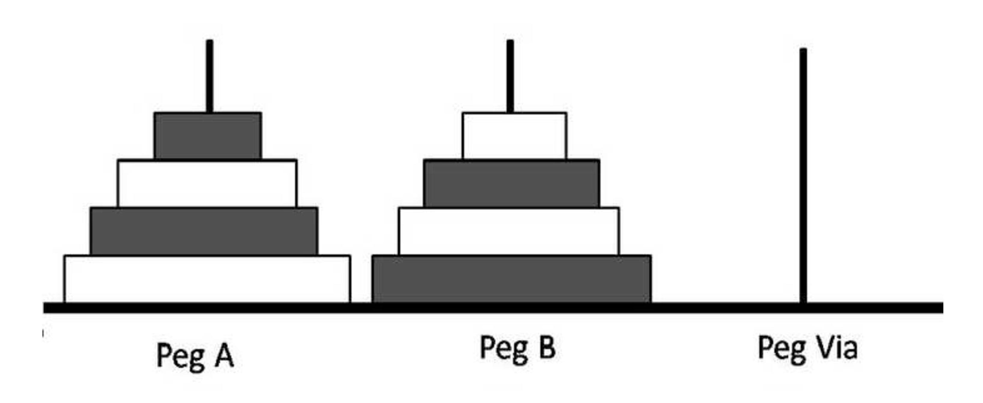 - 이때는 옮길 수 있는 (가장 작은 원반이 아닌) 원반과 그 원반을 옮길 수 있는 기둥이 각각 하나뿐이다. 즉, 가장 작은 원반을 제외하고 규칙에 위반되지 않는 유일한 이동(작은 원반을 큰 원반 위로 옮기는 것)을 수행한다.[13][48]