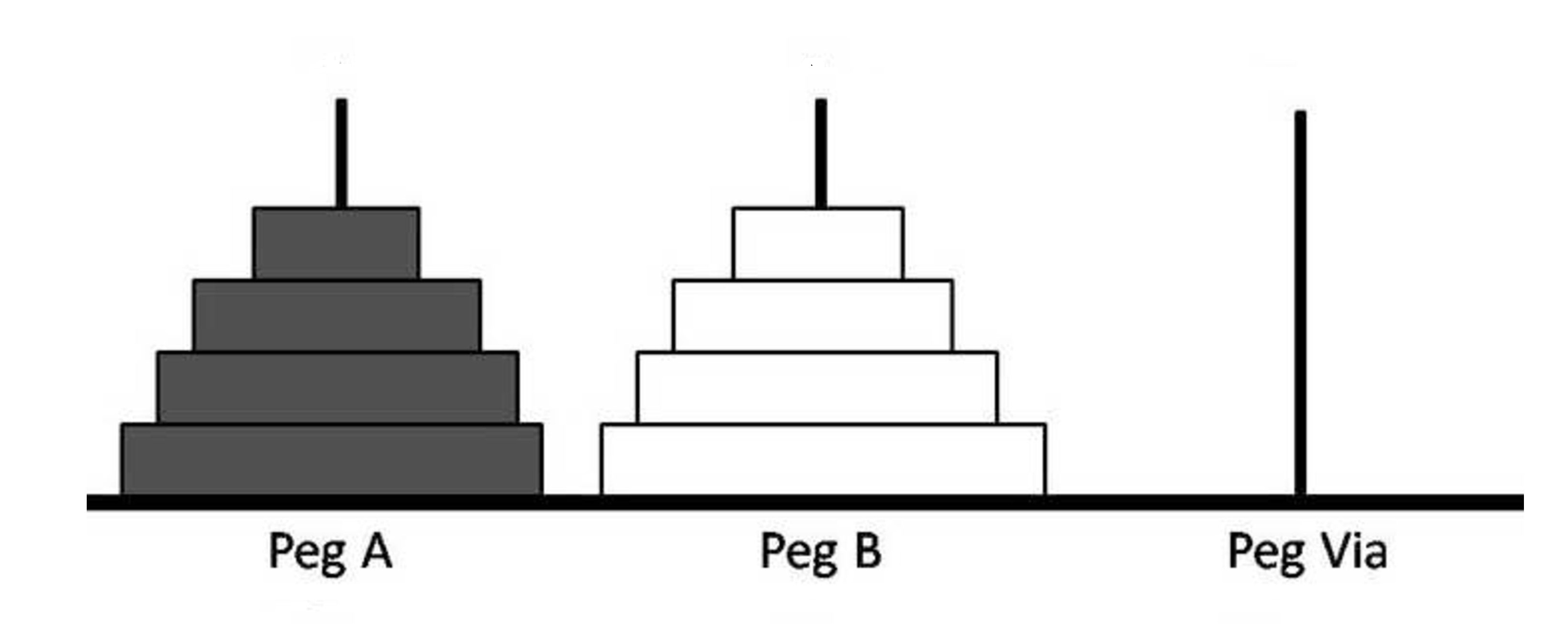 ''n''개의 원반을 기둥 A에서 기둥 C로 옮기는 재귀적인 방법은 다음과 같다 (기둥 B를 보조 기둥으로 사용).