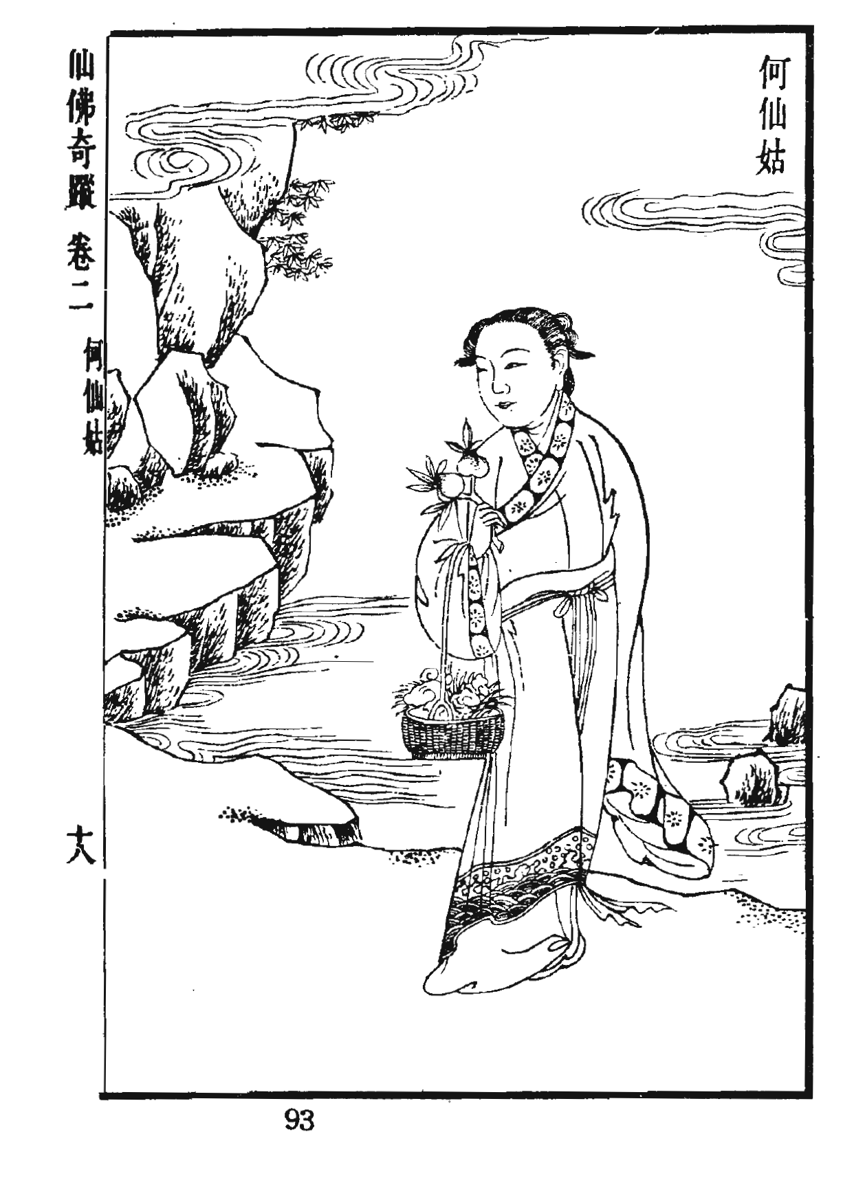 何仙姑중국어는 광둥성 증성구 출신인 하태(何泰)의 딸이었다. 그녀는 태어날 때 머리 꼭대기에 6개의 긴 머리카락이 있었다. 그녀가 14~15세쯤 되었을 때, 신령한 인물이 꿈에 나타나 그녀에게 가루로 된 운모를 먹어 몸을 가볍게 하고 죽음에 면역이 되도록 지시했다. 그녀는 지시대로 하고, 처녀로 남을 것을 맹세했으며, 점차 음식 섭취량을 줄였다.[2]측천무후는 한때 사자를 보내 하선고를 황궁으로 소환했으나, 그녀는 가는 길에 사라졌다.[2]