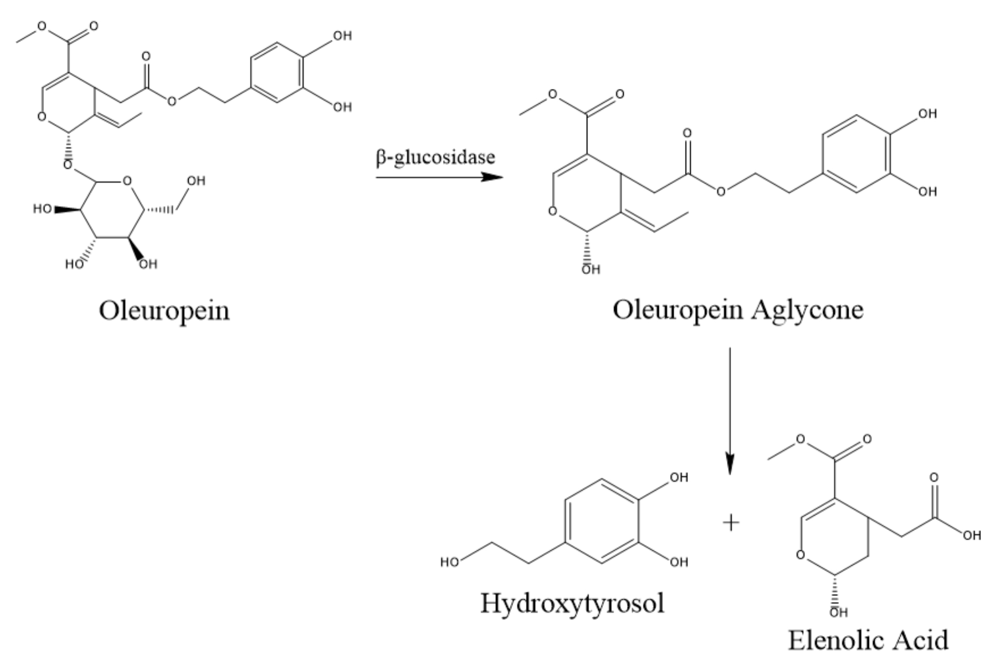 올레우로페인은 엘레놀산 유도체로, 에스테르 및 글리코사이드 결합을 통해 하이드록시티로솔 및 글루코스와 연결된 화합물이며, 올리브의 쓴맛 제거, 색 변화, 프로테아좀 활성제 연구 등에 활용된다. - 페닐에타노이드 - 티로솔