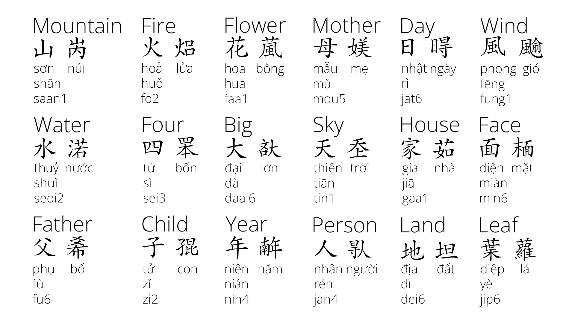 - ''thư'' (書)는 편지를 가리키는 반면, 중국어에서는 책을 의미한다. (베트남어는 ''sách'' (冊)을 대신 사용한다.)