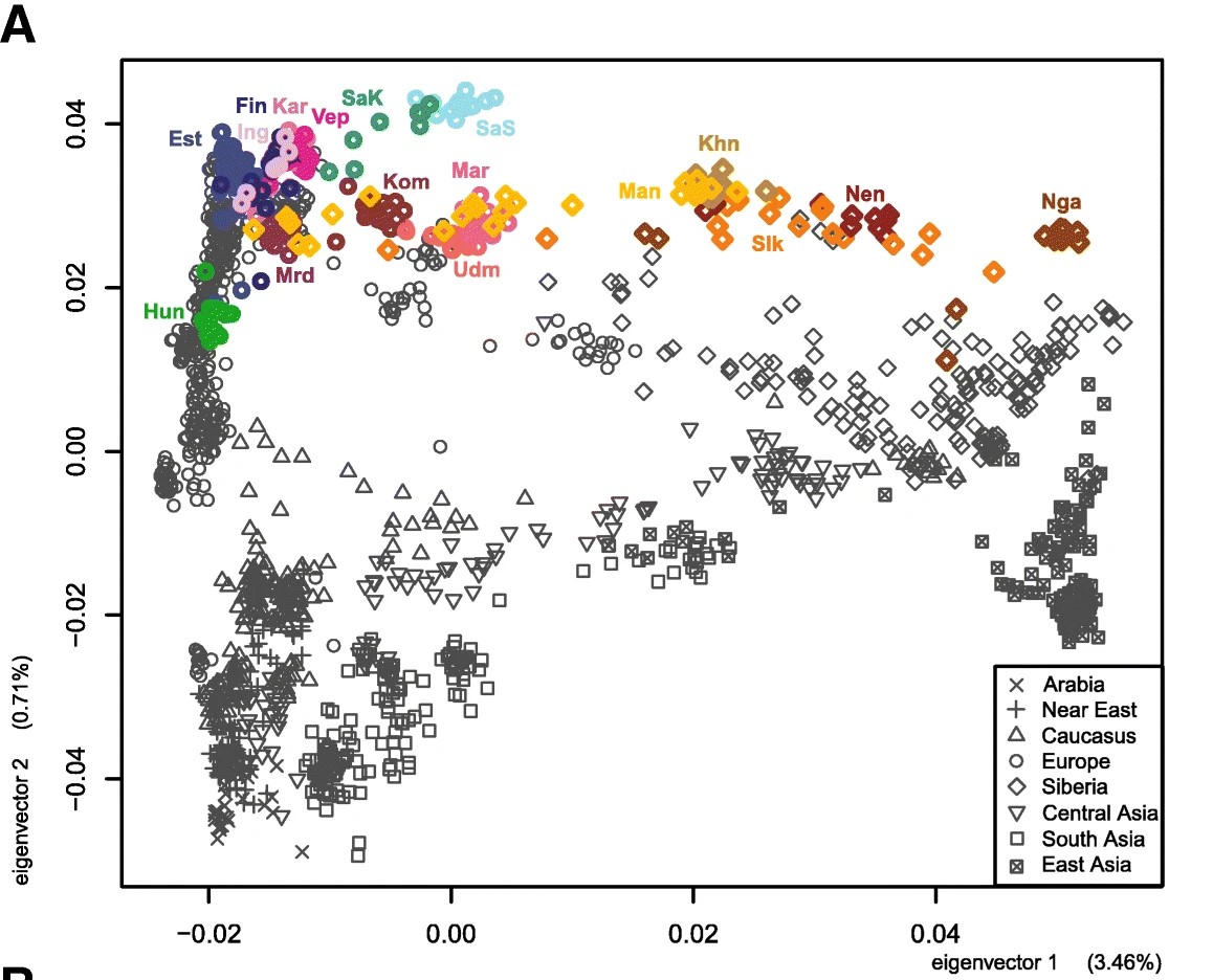 모계 유전자인 미토콘드리아 DNA(mtDNA) 하플로그룹의 경우, U 하플로그룹이 28.3%로 가장 흔하게 나타난다. 특히 하위 그룹인 U4가 16.5%로 높은 비율을 보이며, U7 (5.7%), U5 (5.4%)가 뒤를 잇는다. U2와 U1은 1% 미만으로 드물게 발견된다. 그 외 주요 모계 하플로그룹으로는 H (17.3%), J (13.1%), D (11.6%), C (10.4%) 등이 있다.[12]