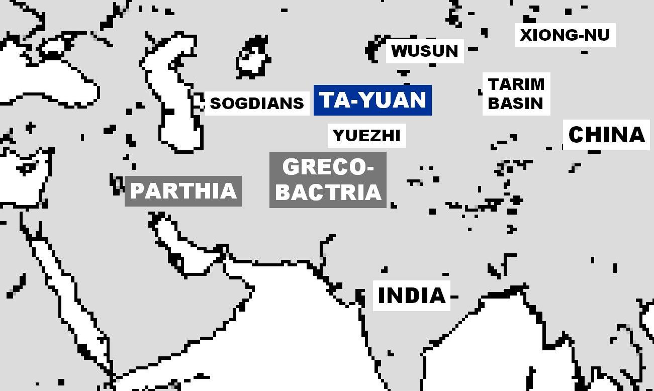 한나라 무제는 "천마"를 얻기 위해 기원전 104년에 페르가나로 대규모 군사 원정을 보냈으나 실패하고 돌아갔다.[4] 기원전 102년, 중국은 6만 명이 넘는 병력과 3만 마리의 말을 동원하여 다시 원정을 떠났다. 이 군대는 여러 마을을 제압했지만 50%의 손실을 입었다. 페르가나 시는 포위되었고, 주민들은 말을 모두 도살하겠다고 위협했지만, 결국 타협하여 중국 군대는 최고의 말과 식량을 제공받았다. 약 30마리의 "천마"와 3,000마리의 중급 또는 하급 말들을 얻었다.[5]