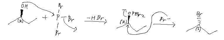 알코올은 브로민화 수소산 또는 삼브로민화 인(PBr3)을 사용하여 브로모알케인으로 전환할 수 있다. 인과 브로민을 사용하는 변환에는 촉매량의 PBr3을 사용할 수 있는데, 이는 반응 중에 생성된다.[5]