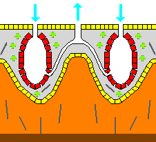 해면에서 가장 단순한 몸 구조는 "아스콘형"으로 알려진 관 또는 꽃병 모양이지만, 이는 동물의 크기를 심각하게 제한한다. 몸 구조는 편모세포의 단일 층으로 둘러싸인 줄기 모양의 해면강으로 특징지어집니다. 단순히 크기를 키우면 부피 대 표면적의 비율이 증가하는데, 표면적은 길이 또는 너비의 제곱에 비례하여 증가하는 반면 부피는 세제곱에 비례하여 증가하기 때문이다. 음식과 산소가 필요한 조직의 양은 부피에 따라 결정되지만, 음식과 산소를 공급하는 펌핑 용량은 편모세포가 덮인 면적에 따라 달라진다. 아스콘형 해면은 직경이 1mm를 넘는 경우가 거의 없다.[17]