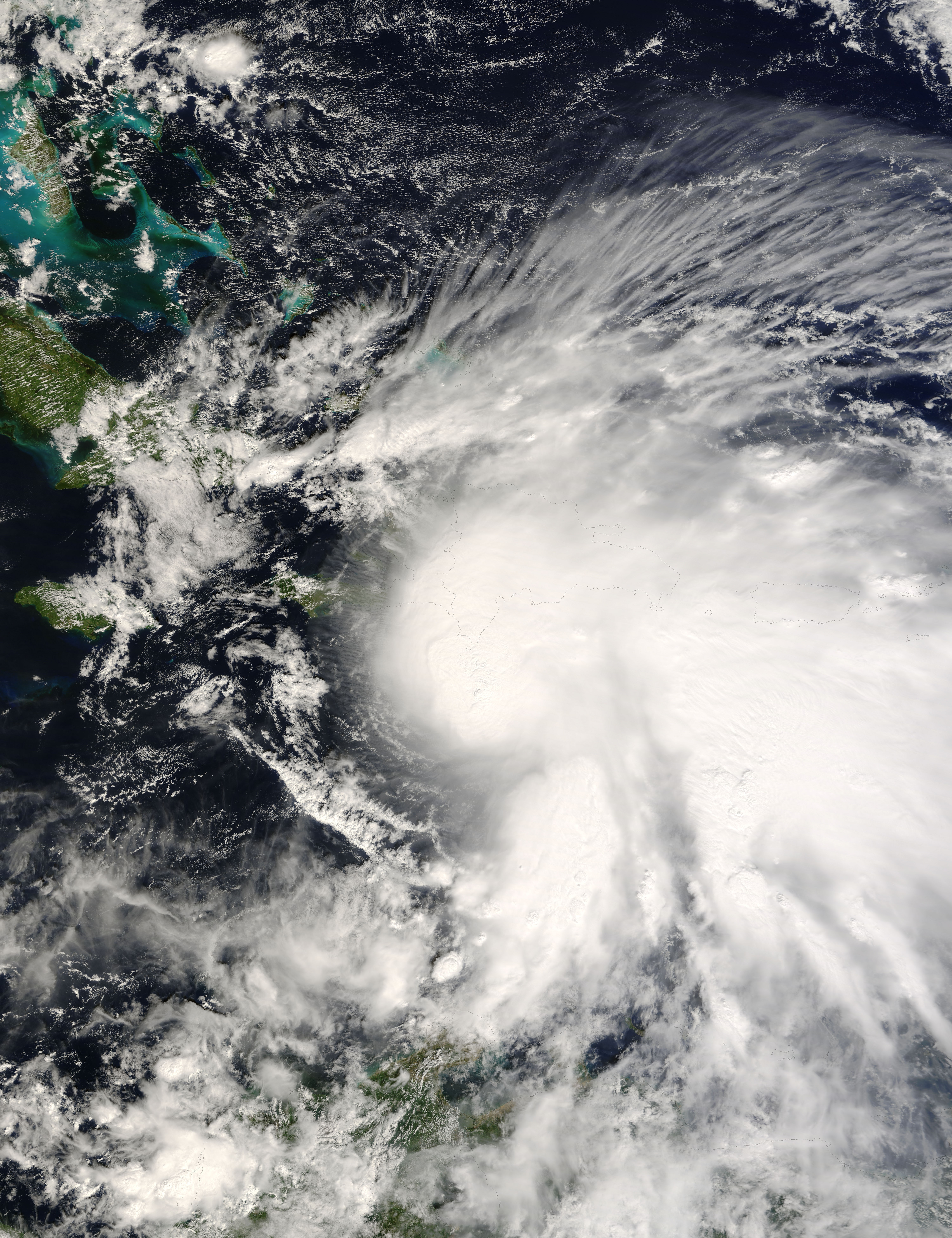 10월 25일에는 미국령 버진 아일랜드를 지나고, 다음 날에는 푸에르토리코 남동쪽을 통과했다.[57] 10월 27일 윈드 시어가 감소하면서 폭풍우가 중심 위에서 증가하며 더 조직화되었고, 10월 28일 0000 UTC에 아이티 포르토프랭스 남남동쪽 약 약 346.01km 떨어진 곳에서 열대저기압 제16호로 발달했다.[57]