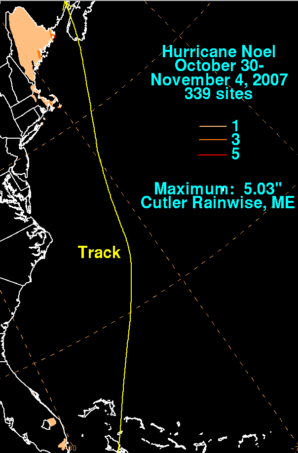 허리케인 노엘은 11월 2일 바하마 나소에서 북북동쪽으로 약 약 289.68km 떨어진 곳에서 허리케인으로 발달하였다.[24] 그러나 점차 차가운 해역을 지나면서 약해지기 시작했고, 열대적 특성을 잃으면서 풍속은 빨라졌다.[25] 11월 2일 늦게 노엘의 중심부는 크게 줄어들었고, 사이클론의 구조는 비대칭적이고 한랭 전선과 비슷하게 변하였다. 미국 국립 허리케인 센터는 노엘이 온대저기압으로 전환되기 시작했다고 판단하여 허리케인 노엘에 대한 마지막 관측 보고서를 발표하였다.[26]11월 3일 초, 온대저기압으로 변한 노엘은 여전히 85mph의 강풍을 동반하고 있었으며, 점차 북북동쪽으로 이동하였다.[27] 11월 4일에는 노바스코샤와 뉴브런즈윅을 통과했다.[29]