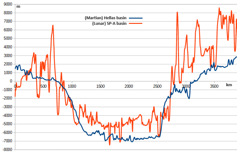 헬라스 평원은 지름이 약 2300km에 달하는 거대한 충돌 분지로, 화성의 지형학적 기준면보다 7152m 더 깊다.[1] 가장자리와 바닥 사이의 고도 차이는 9000m 이상이다.